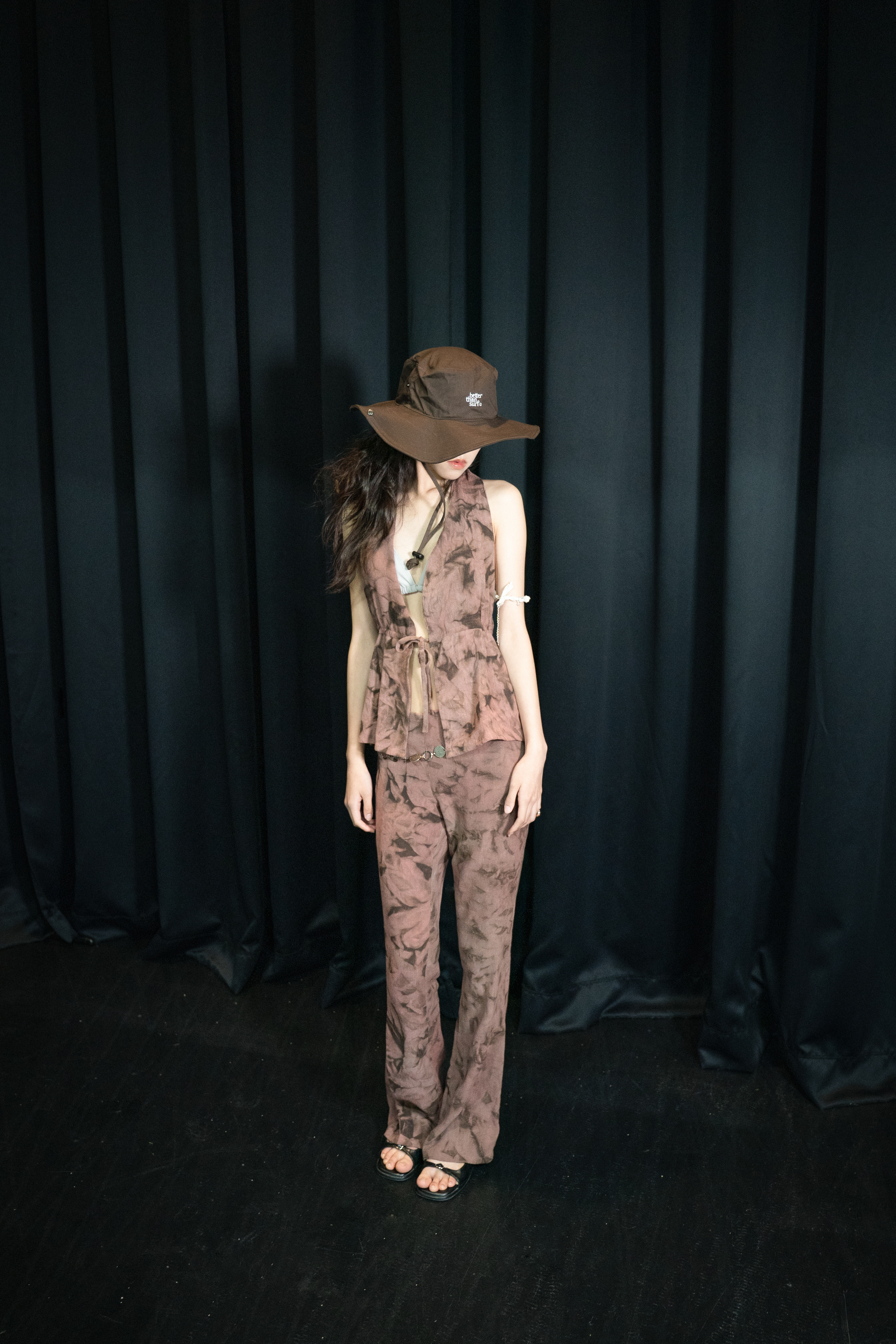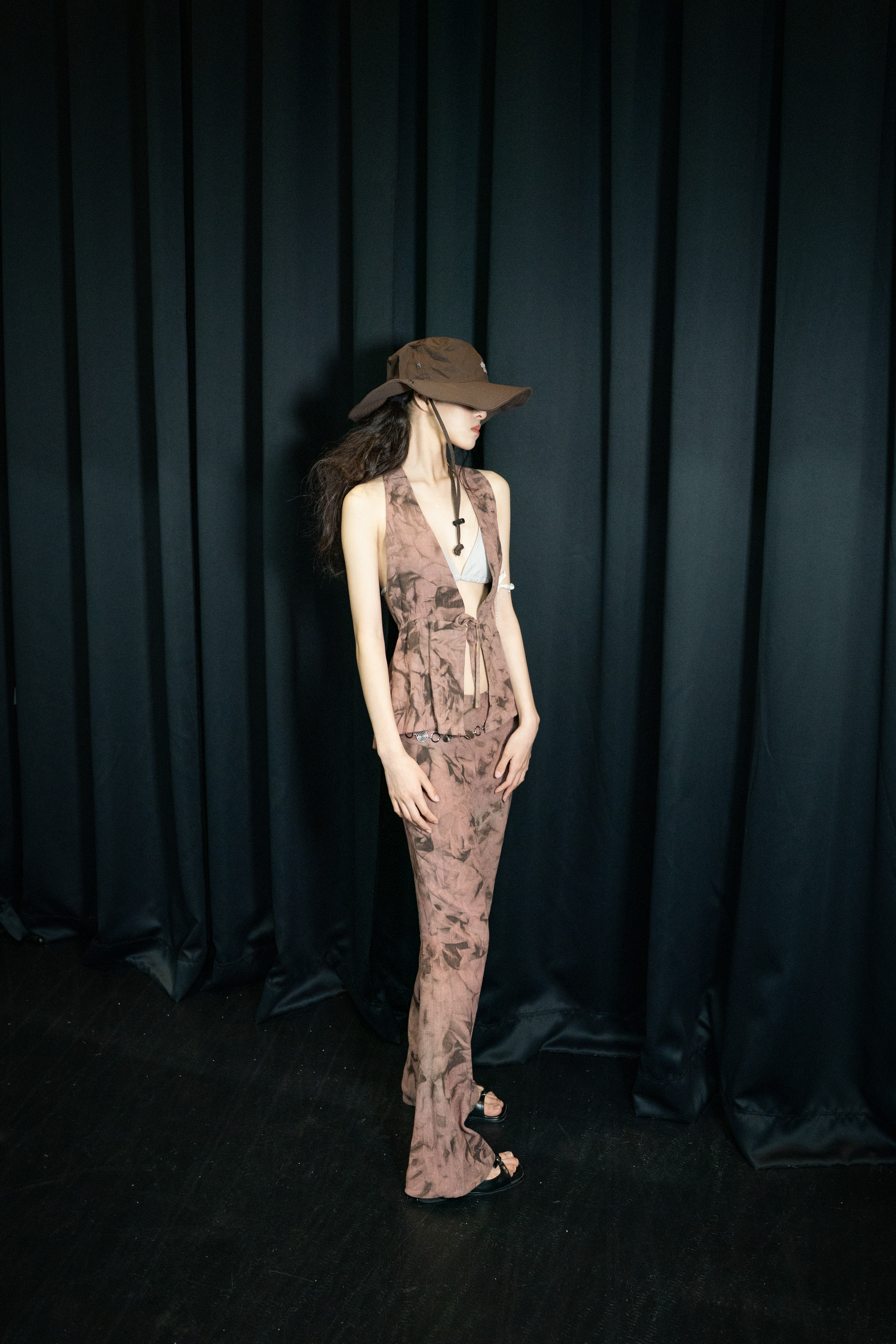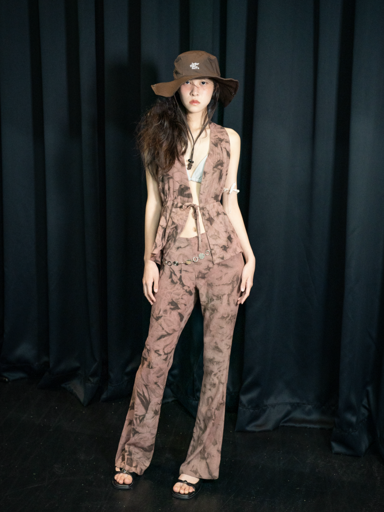 고혹적이지만 날카로운 장미를 온전히 품은 룩. 감의 고독한 브라운으로 날렵한 장미의 가시 텍스처를, 락의 은은하면서도 깊은 핑크빛으로 장미의 관능적인 이미지를 묘사했습니다. 디자인 역시 홀터넥 탑은 가슴과 어깨 라인을 드러내어 치명적인 매력을 강조하며, 부츠컷 팬츠는 허리와 골반 그리고 무릎까지 떨어지는 아름다운 곡선을 드라마틱 하게 연출합니다.