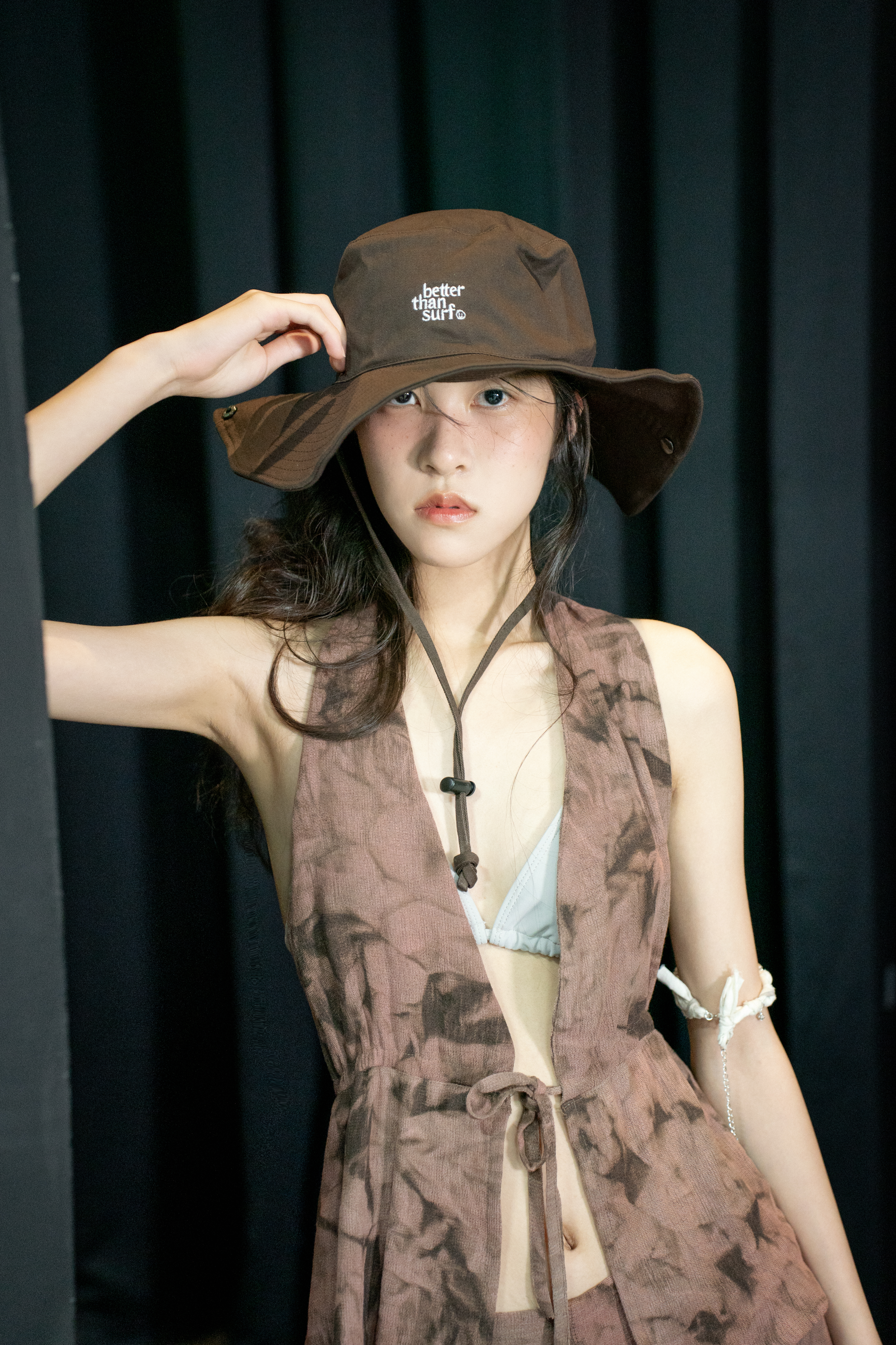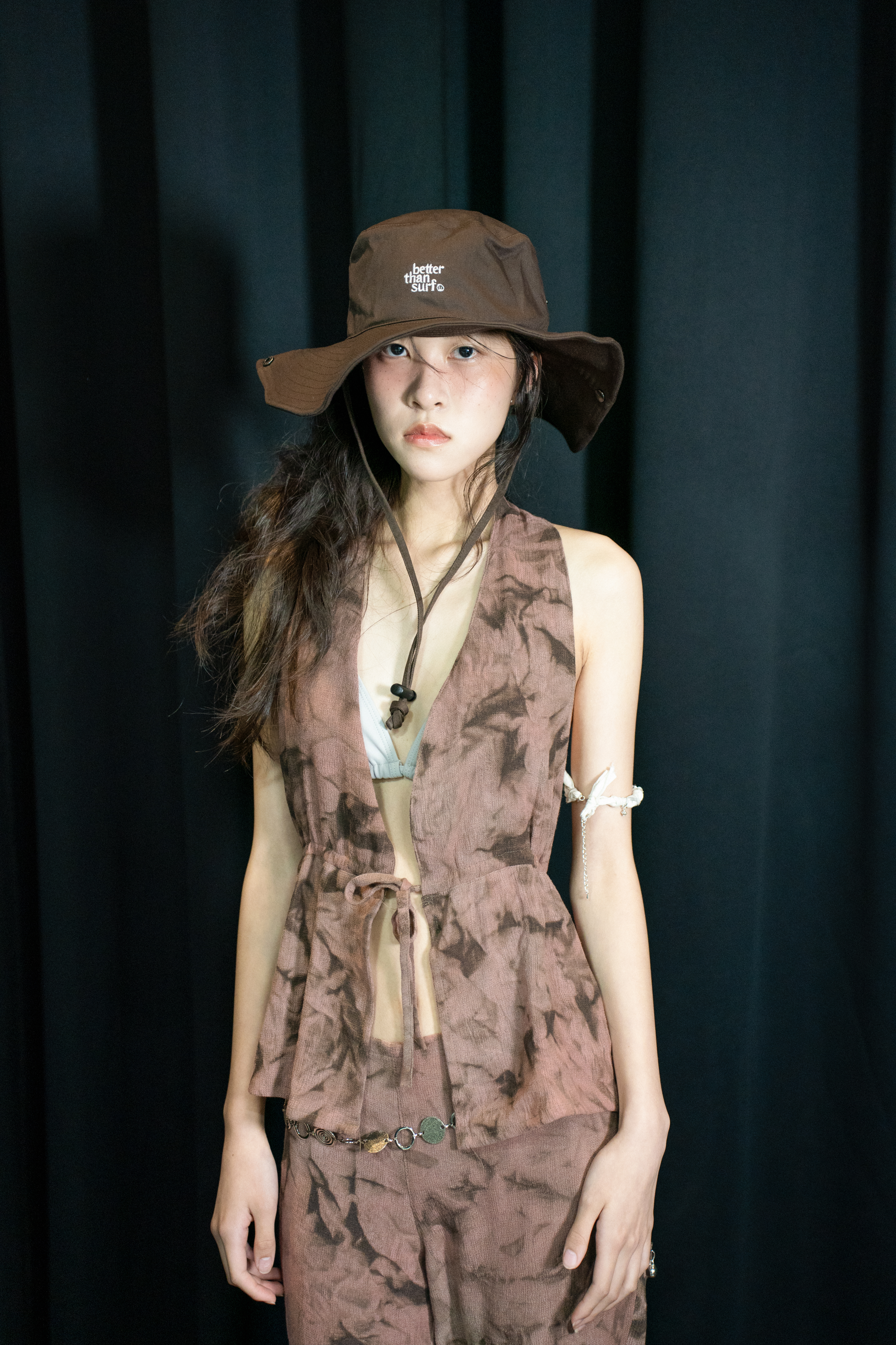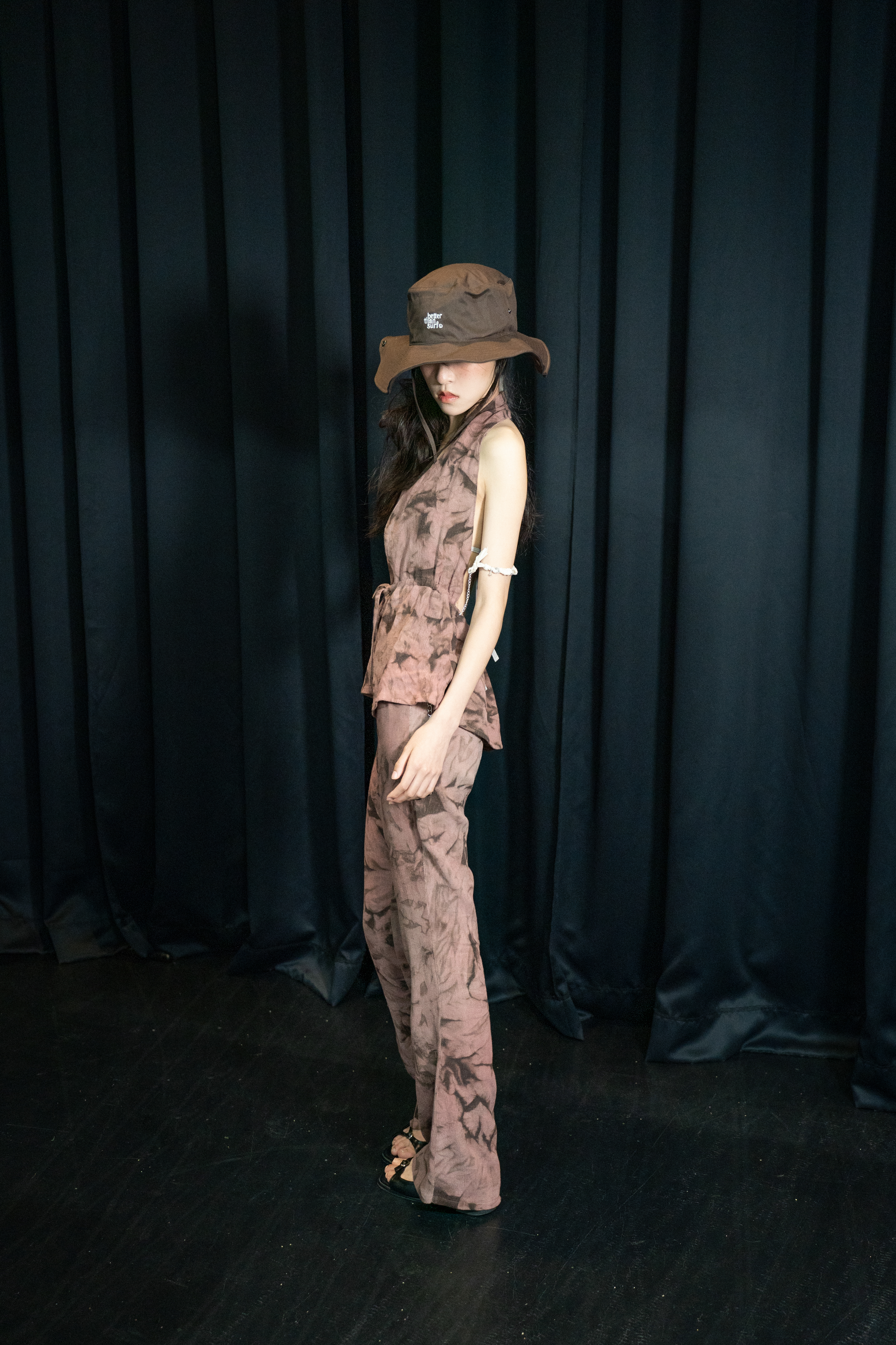 고혹적이지만 날카로운 장미를 온전히 품은 룩. 감의 고독한 브라운으로 날렵한 장미의 가시 텍스처를, 락의 은은하면서도 깊은 핑크빛으로 장미의 관능적인 이미지를 묘사했습니다. 디자인 역시 홀터넥 탑은 가슴과 어깨 라인을 드러내어 치명적인 매력을 강조하며, 부츠컷 팬츠는 허리와 골반 그리고 무릎까지 떨어지는 아름다운 곡선을 드라마틱 하게 연출합니다.