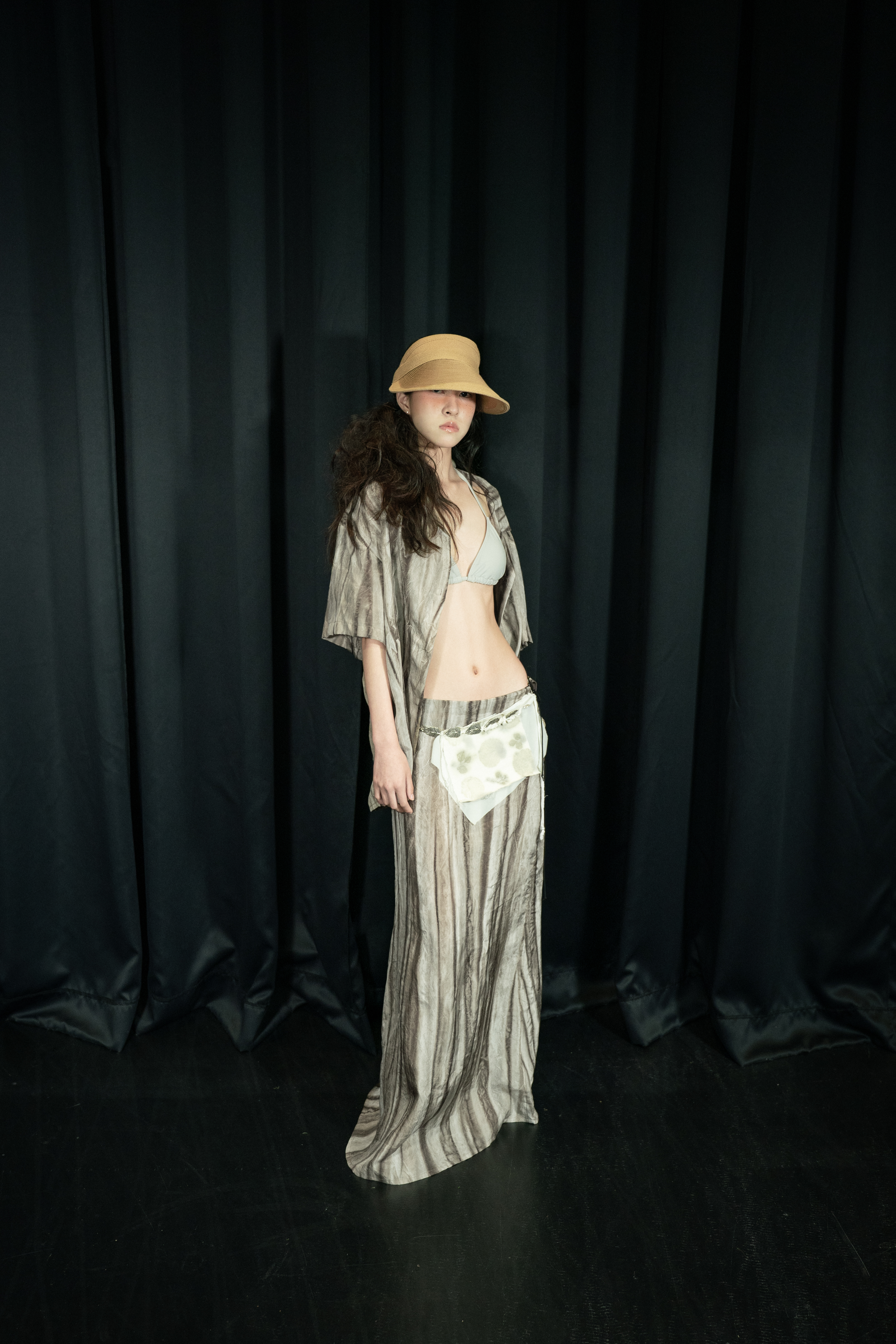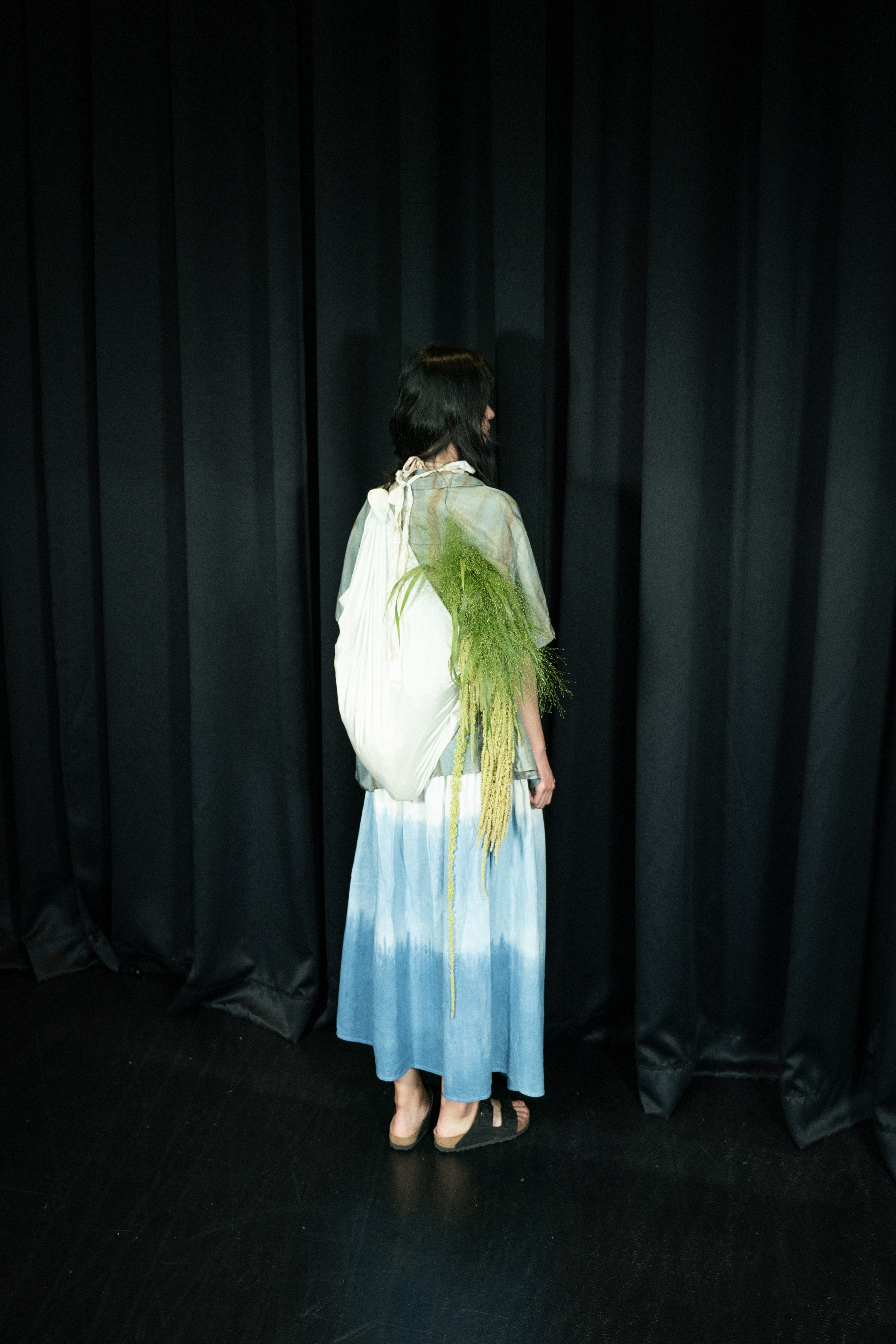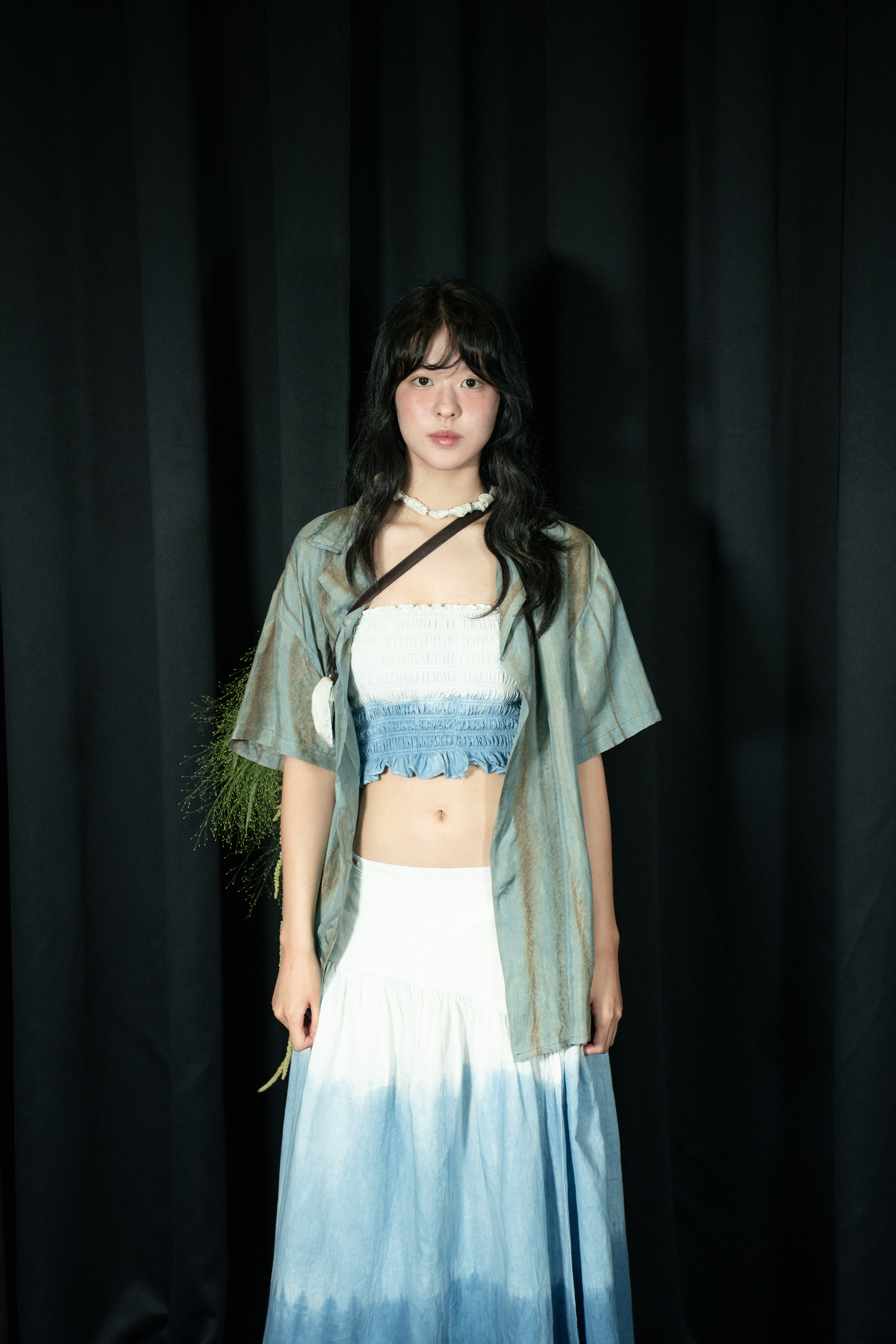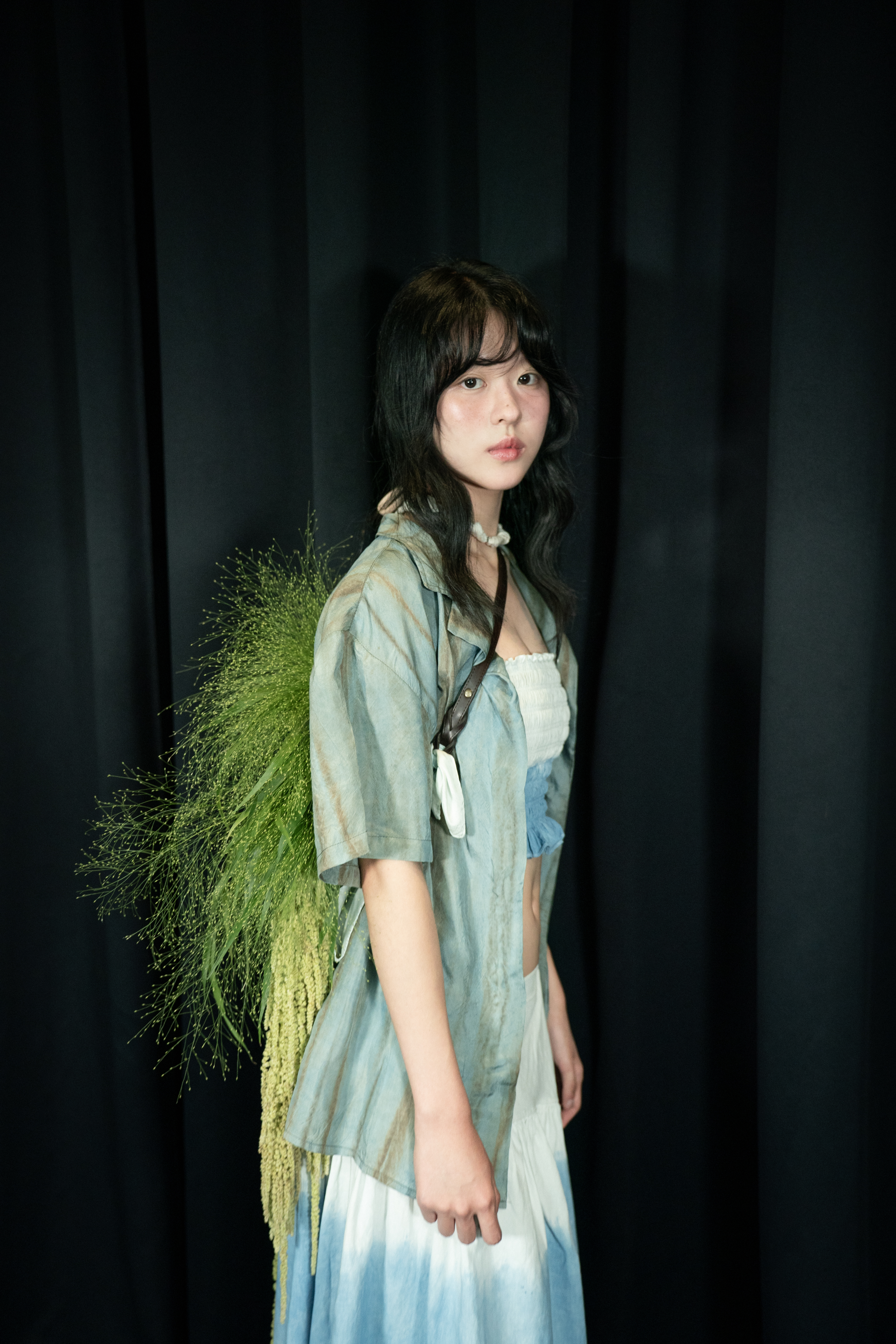 풋감을 짜낸 후 원단에 감즙을 묻힌 뒤 세로로 길게 주름을 잡습니다. 햇볕에 2주 정도 구워 갈색을 냅니다. 그 뒤 다양한 컬러로 배경색을 입힙니다. 쪽으로 하늘과 파랑을, 치자로 노랑을, 이 둘을 합쳐 초록을 물들입니다.