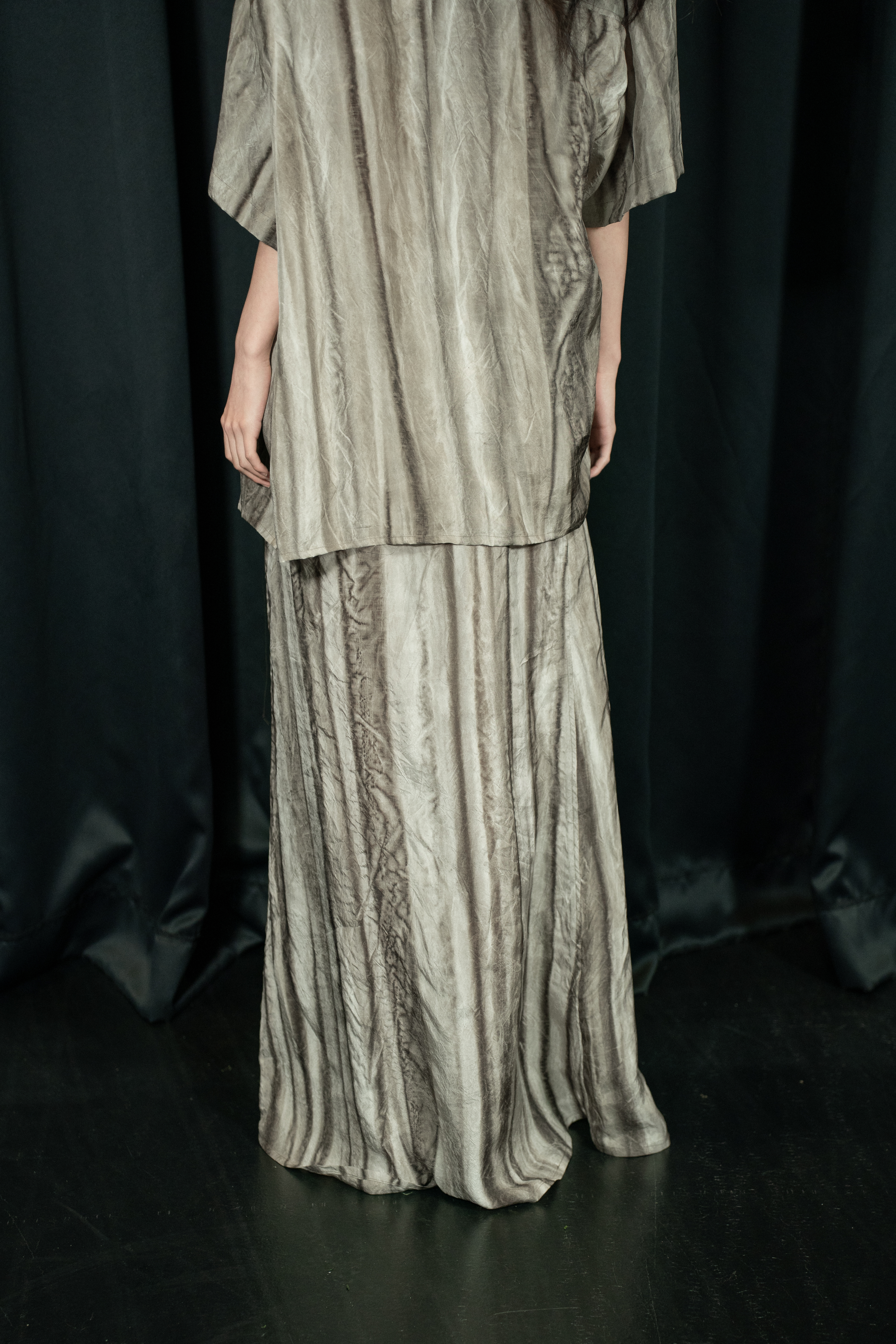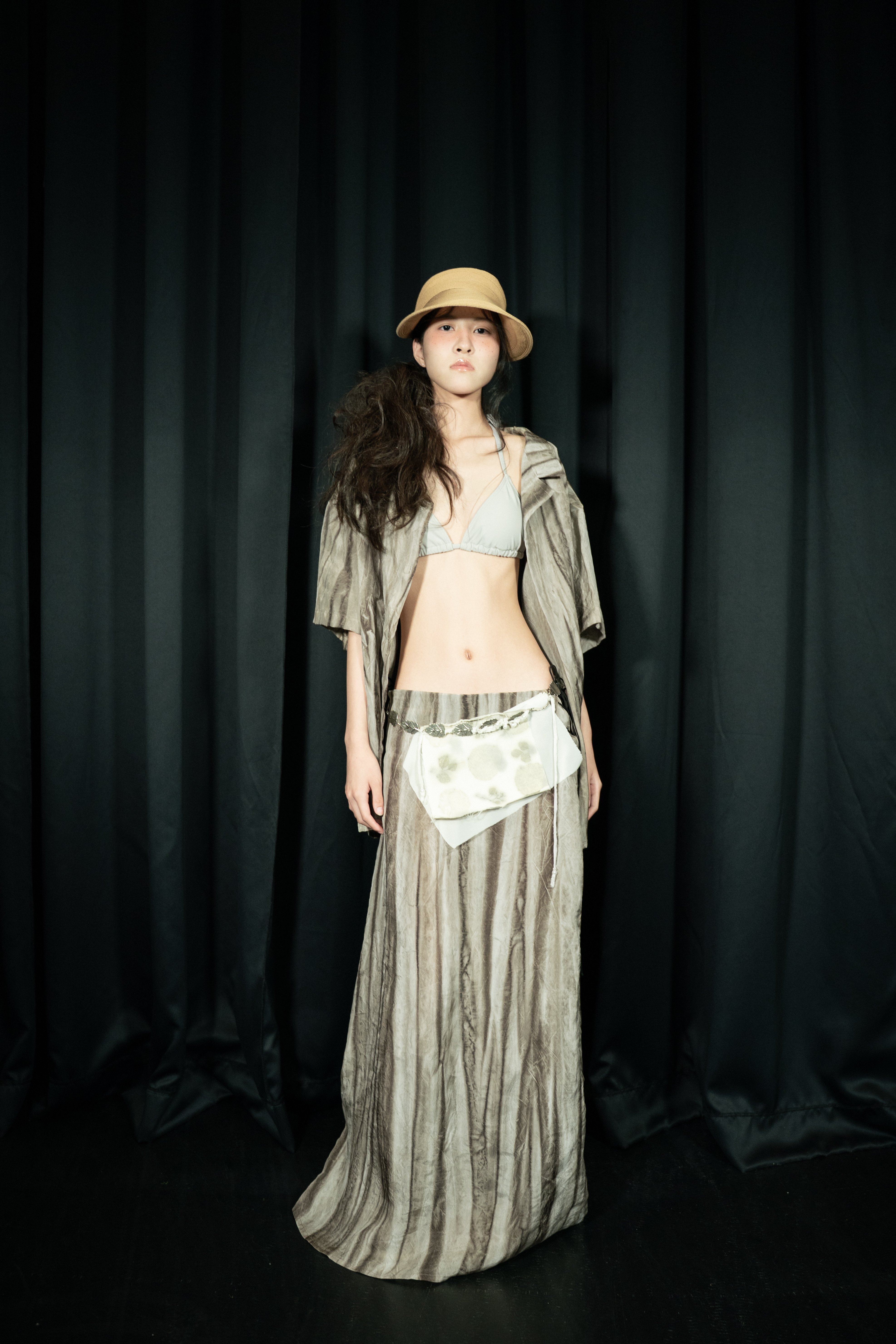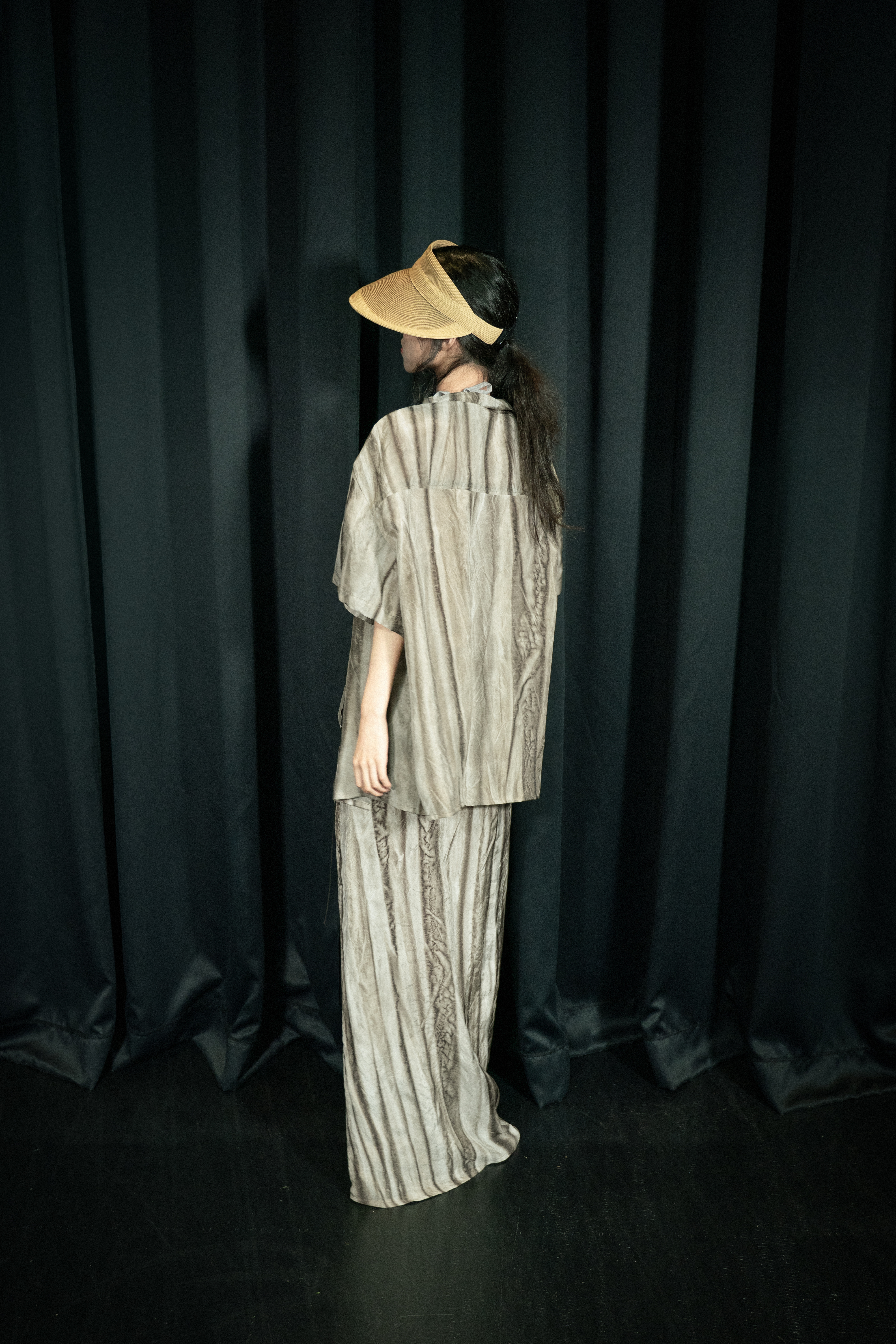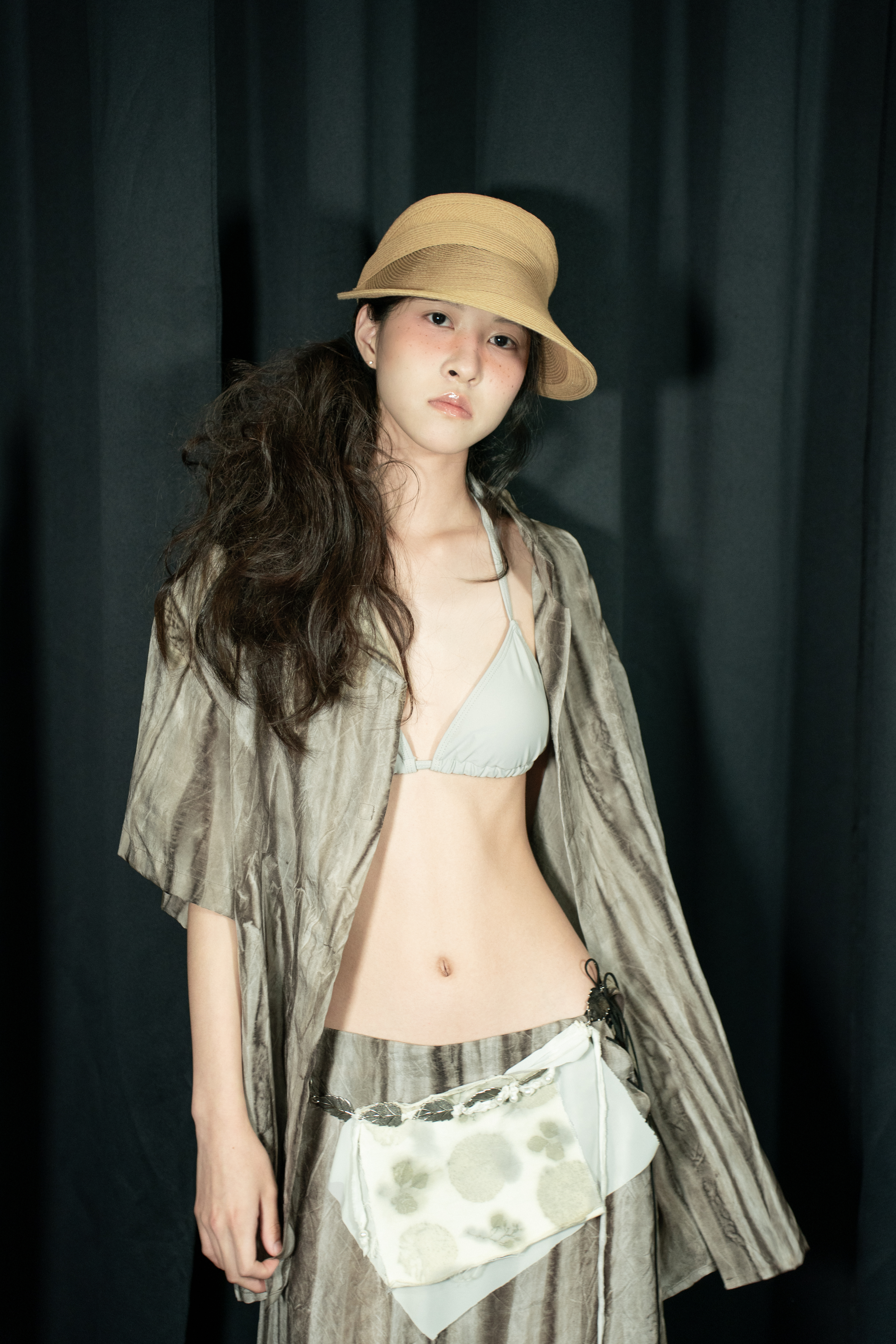 풋감을 짜낸 후 원단에 감즙을 묻힌 뒤 세로로 길게 주름을 잡습니다. 햇볕에 2주 정도 구워 갈색을 냅니다. 그 뒤 다양한 컬러로 배경색을 입힙니다. 쪽으로 하늘과 파랑을, 치자로 노랑을, 이 둘을 합쳐 초록을 물들입니다.
