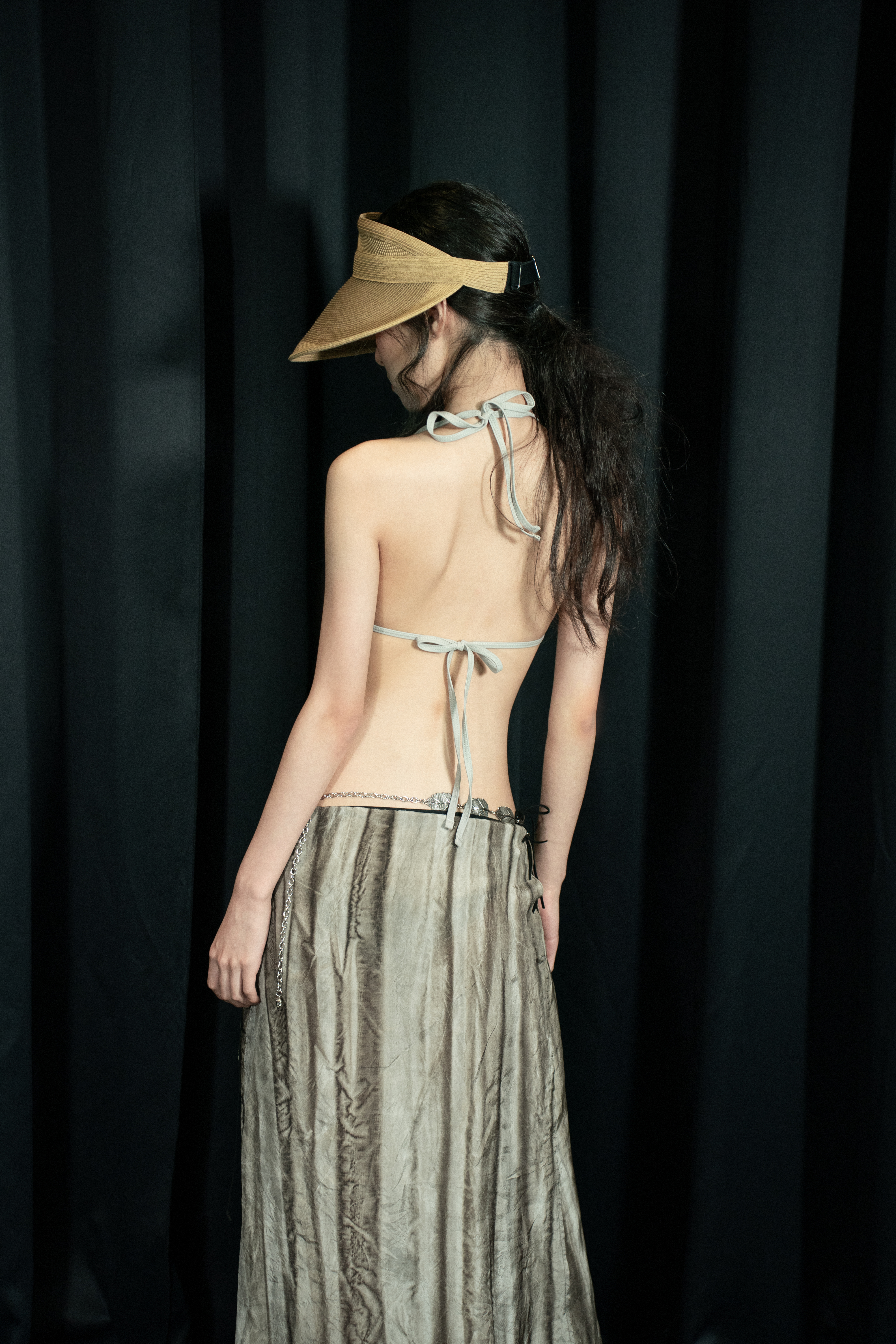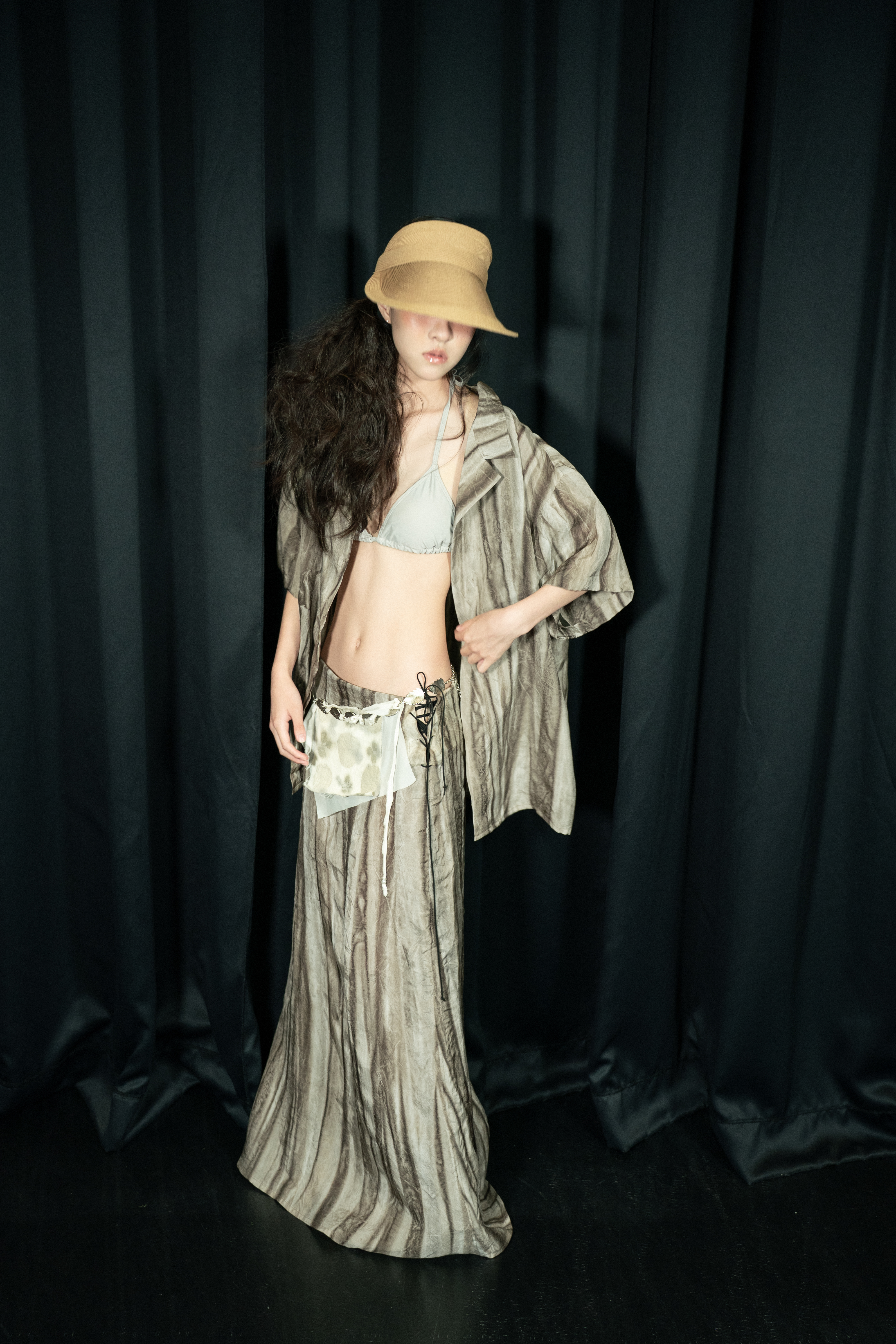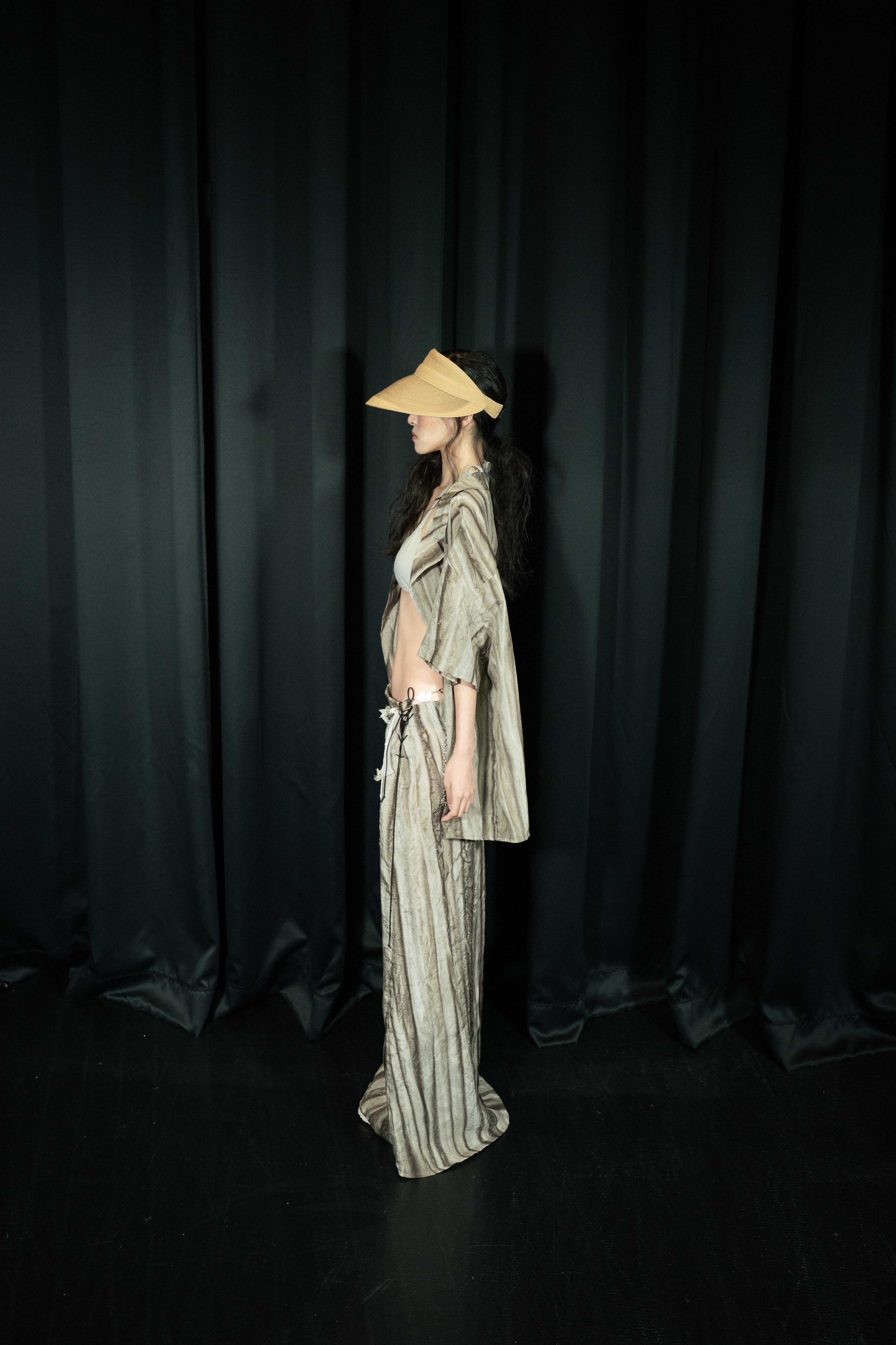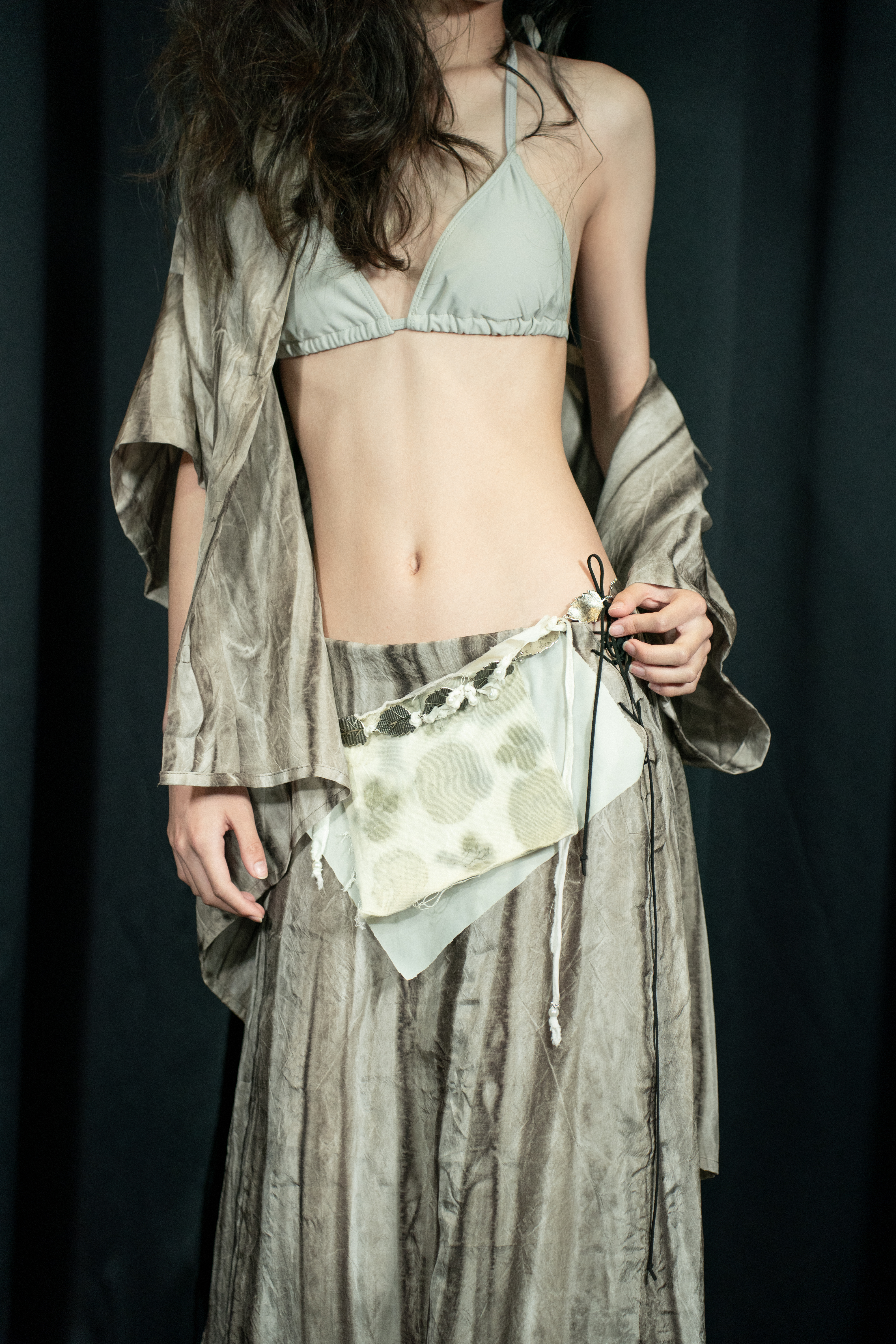 풋감을 짜낸 후 원단에 감즙을 묻힌 뒤 세로로 길게 주름을 잡습니다. 햇볕에 2주 정도 구워 갈색을 냅니다. 그 뒤 다양한 컬러로 배경색을 입힙니다. 쪽으로 하늘과 파랑을, 치자로 노랑을, 이 둘을 합쳐 초록을 물들입니다.
