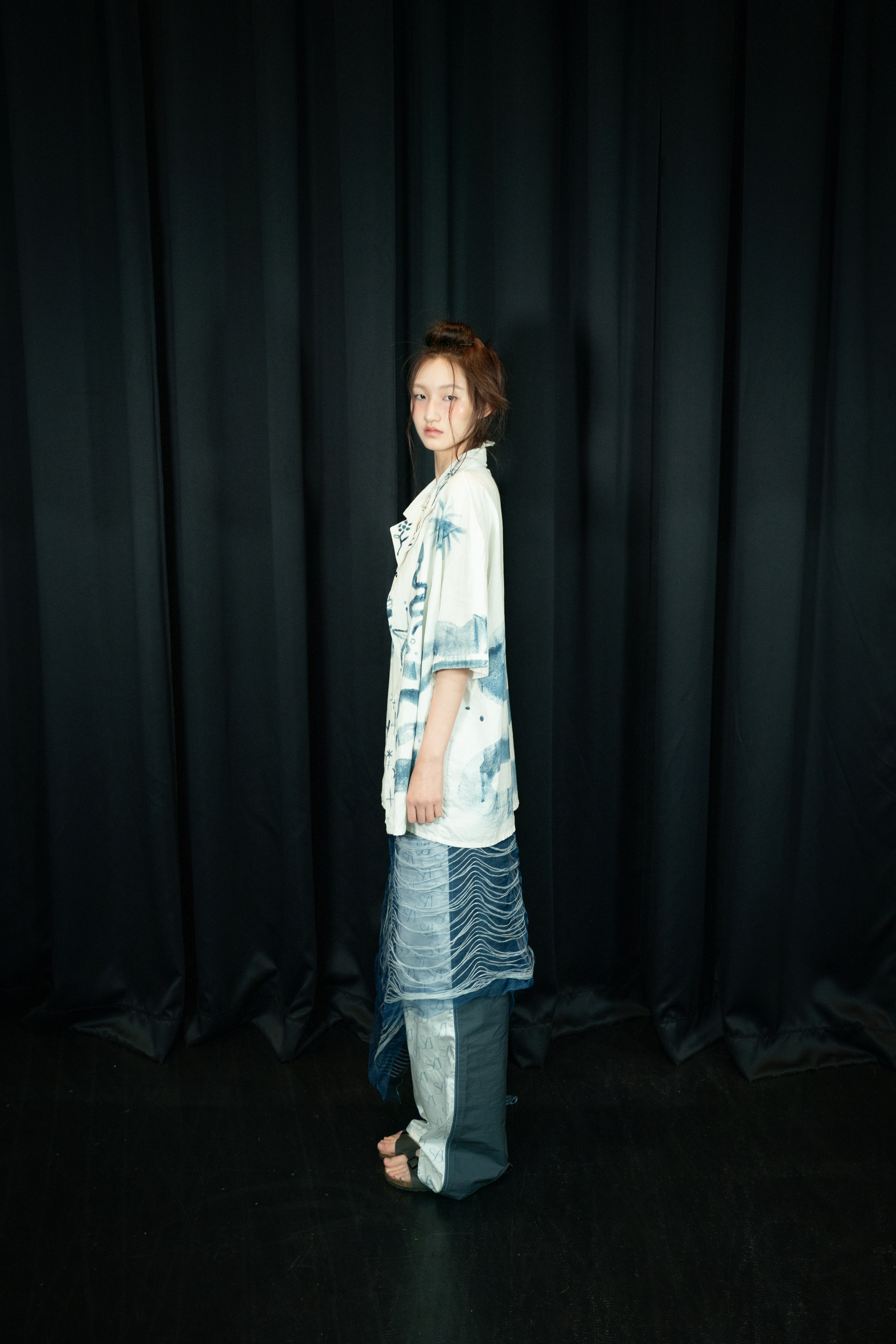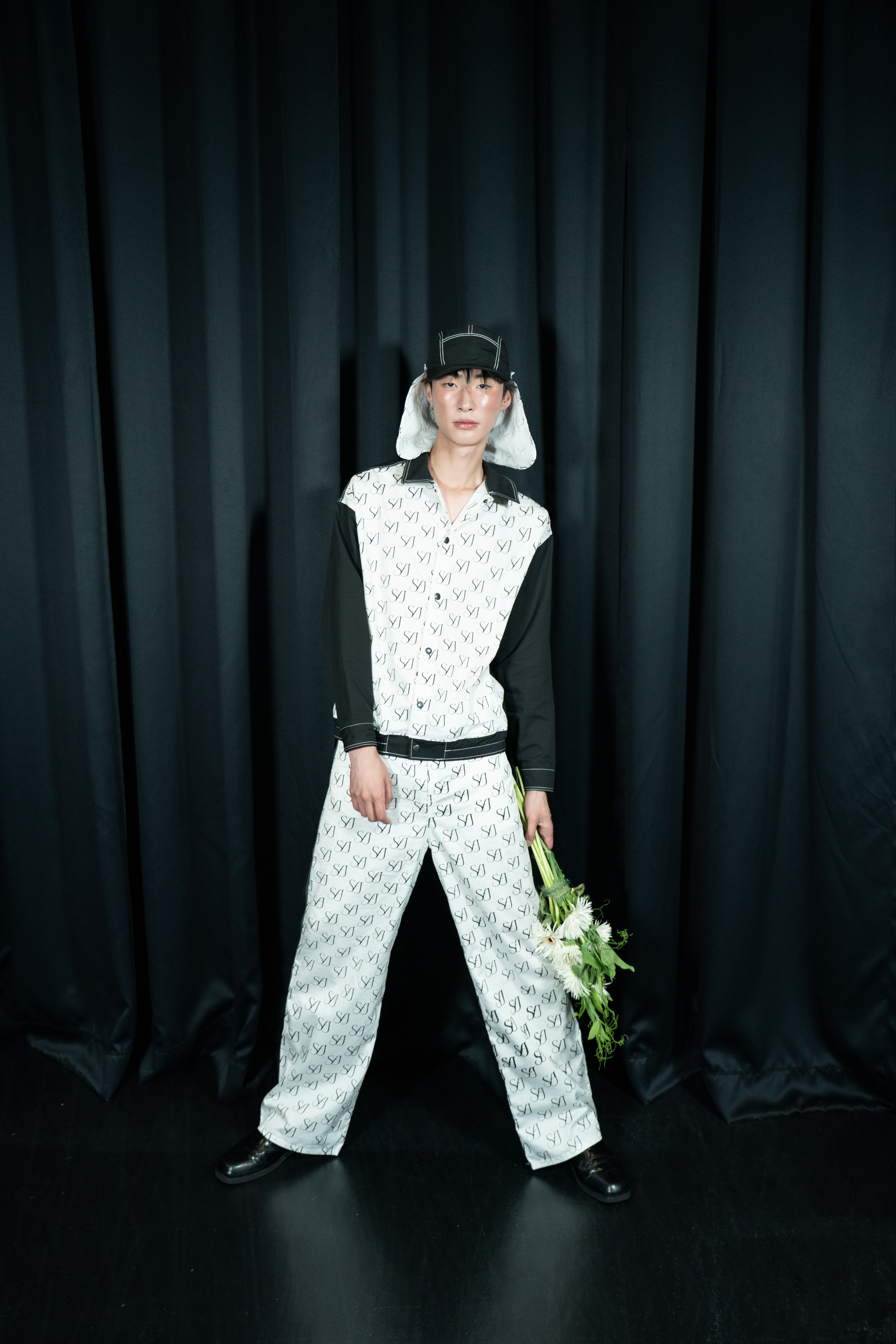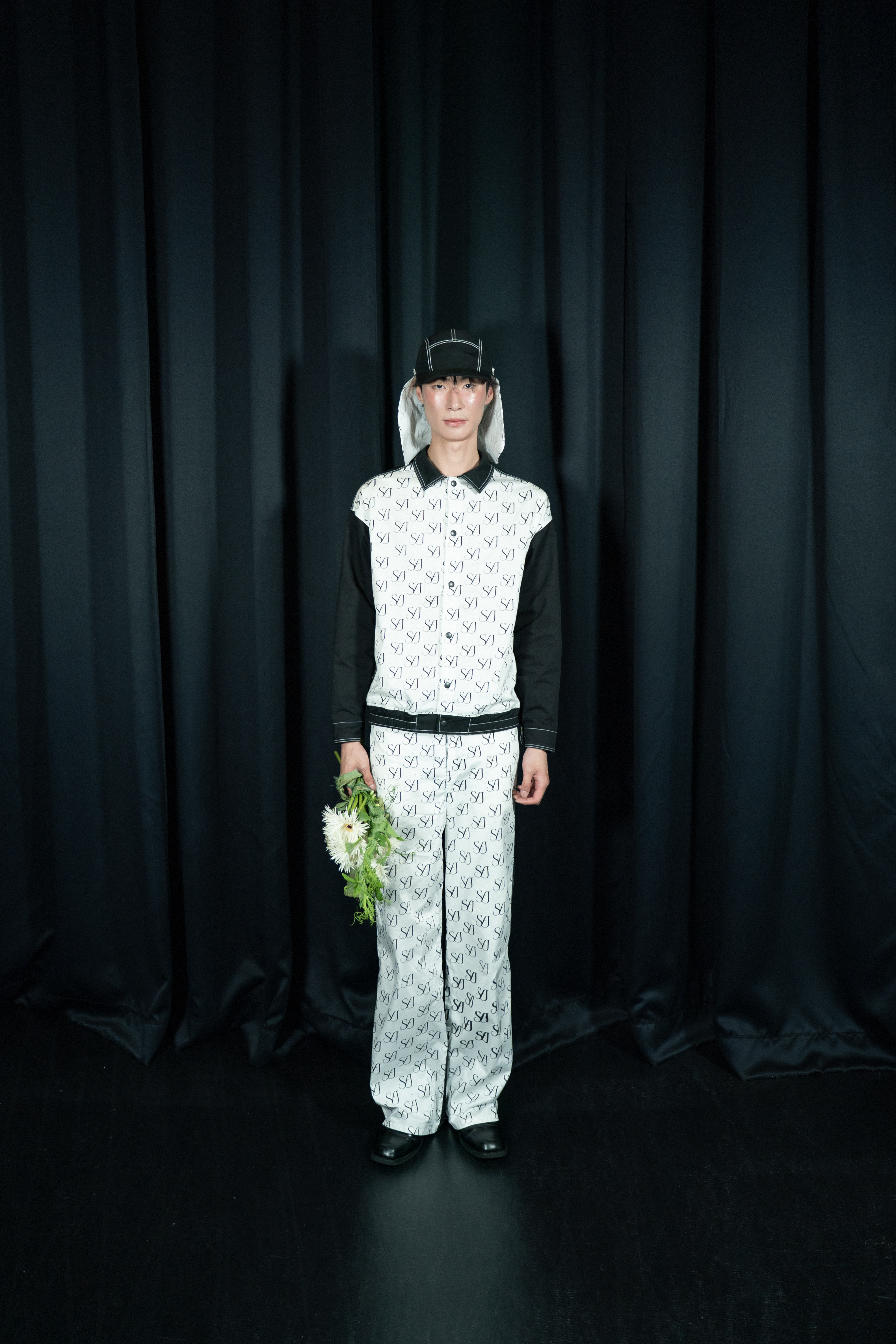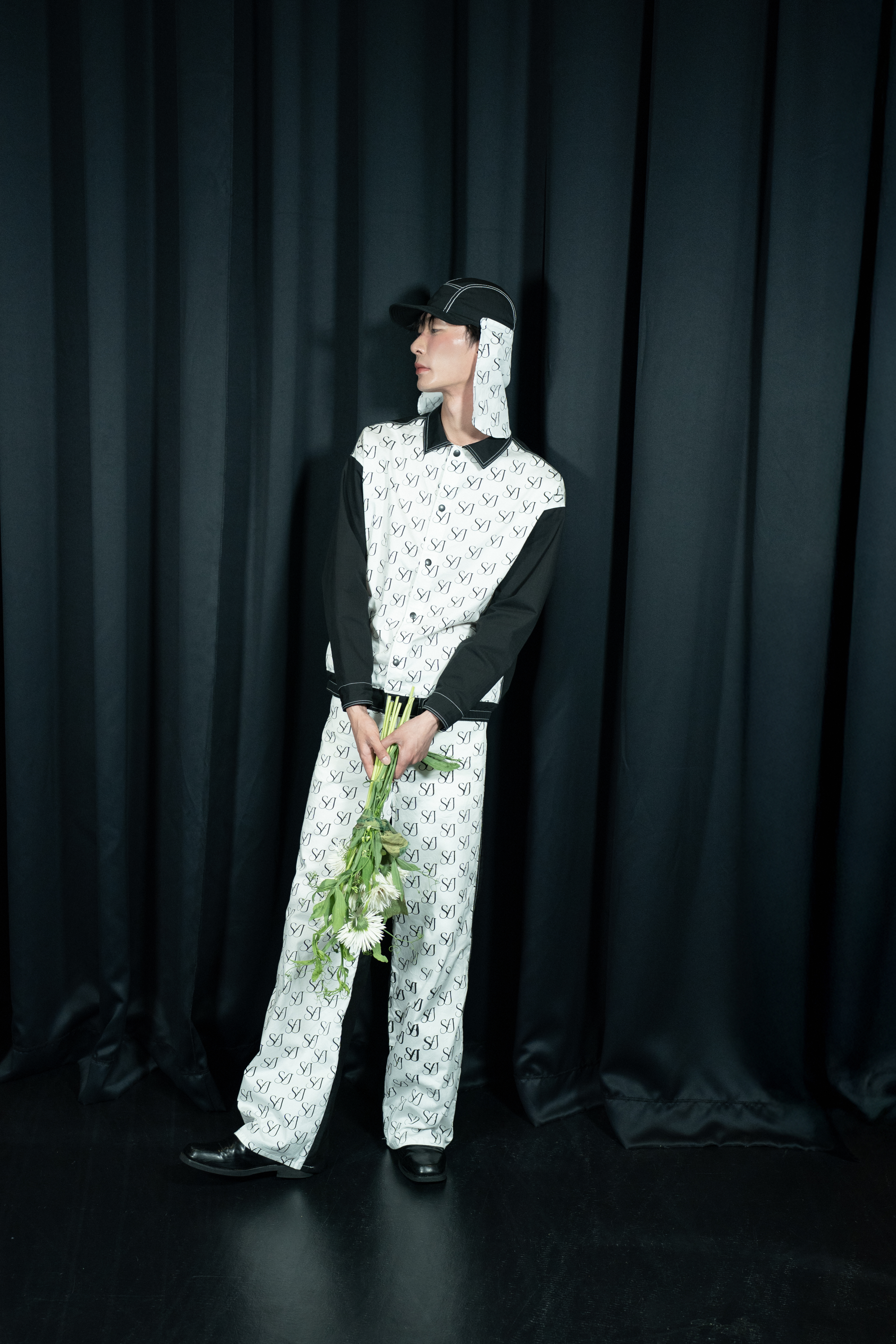 실크스크린 위를 지나간 먹의 흔적이 정교한 패턴으로 탄생했습니다. 반복되는 로고 패턴 플레이인 텍스타일 디자인을 컴퓨터 그래픽이 아닌 사람의 손으로 한 땀 한 땀 찍어내는 과정은, 고도의 집중과 긴 시간 속에서 오직 정성으로 완성됩니다. 크롭한 상의의 블루종과 와일드한 실루엣의 팬츠 조합은 모던하면서도 럭셔리한 매력을 동시에 가집니다.