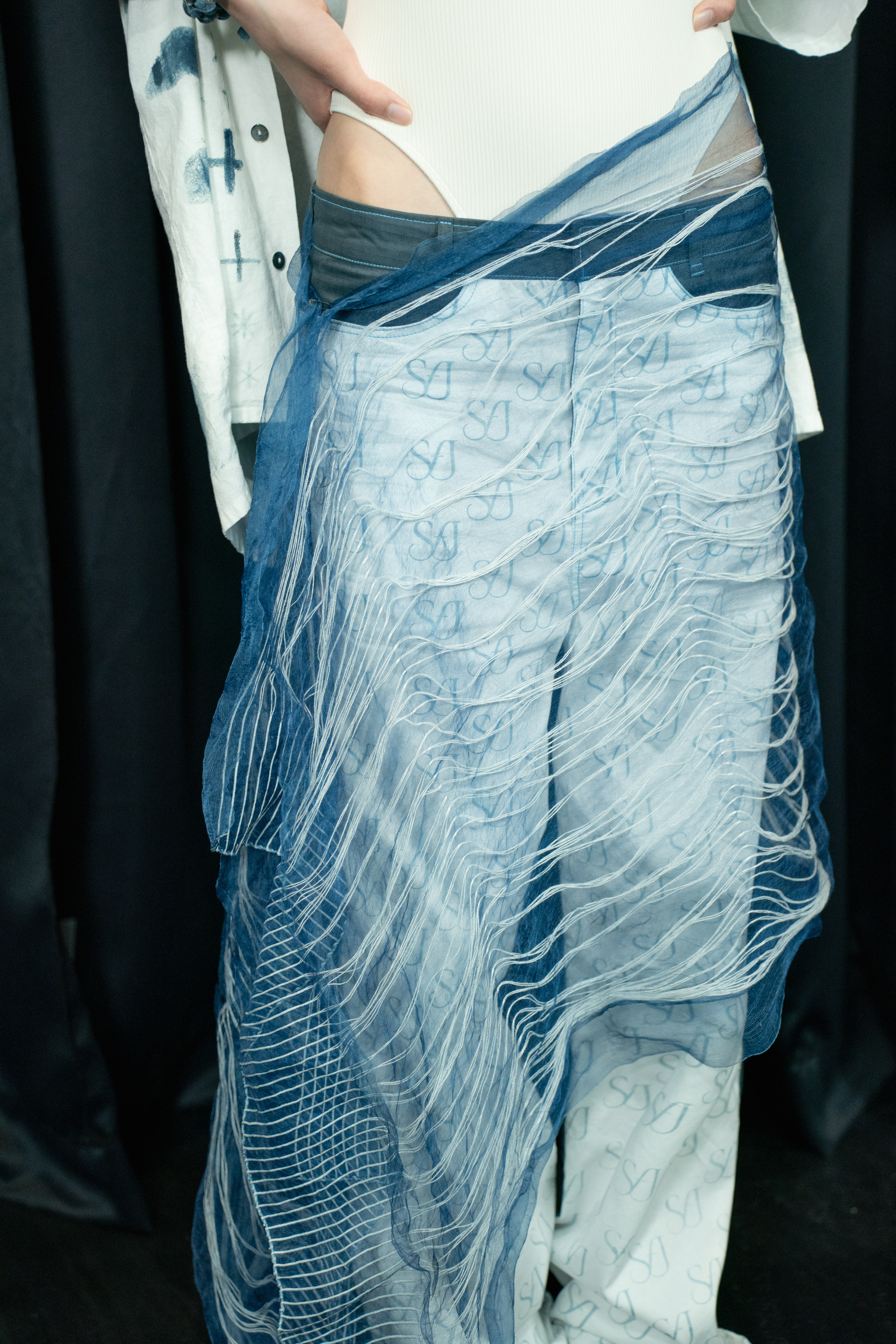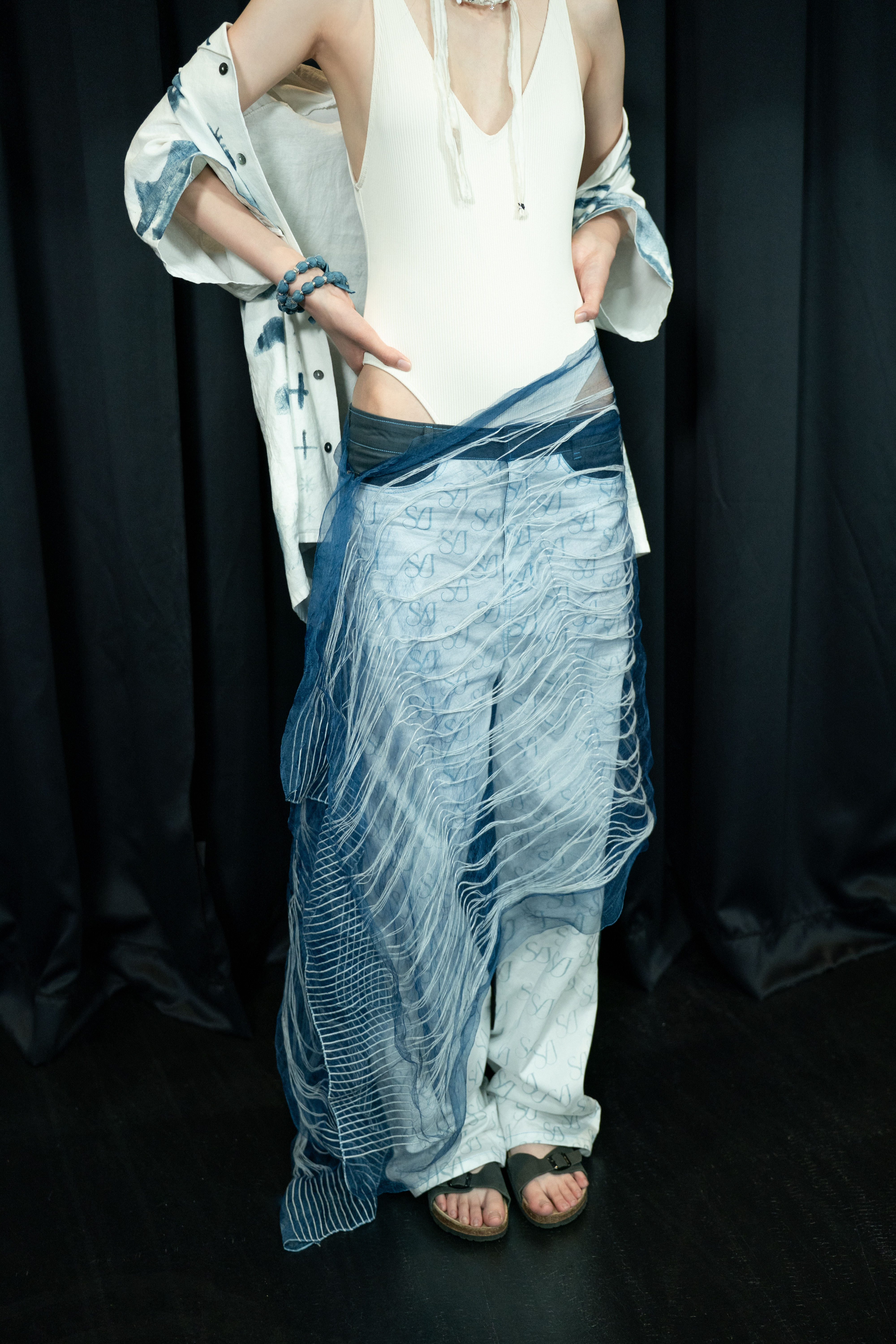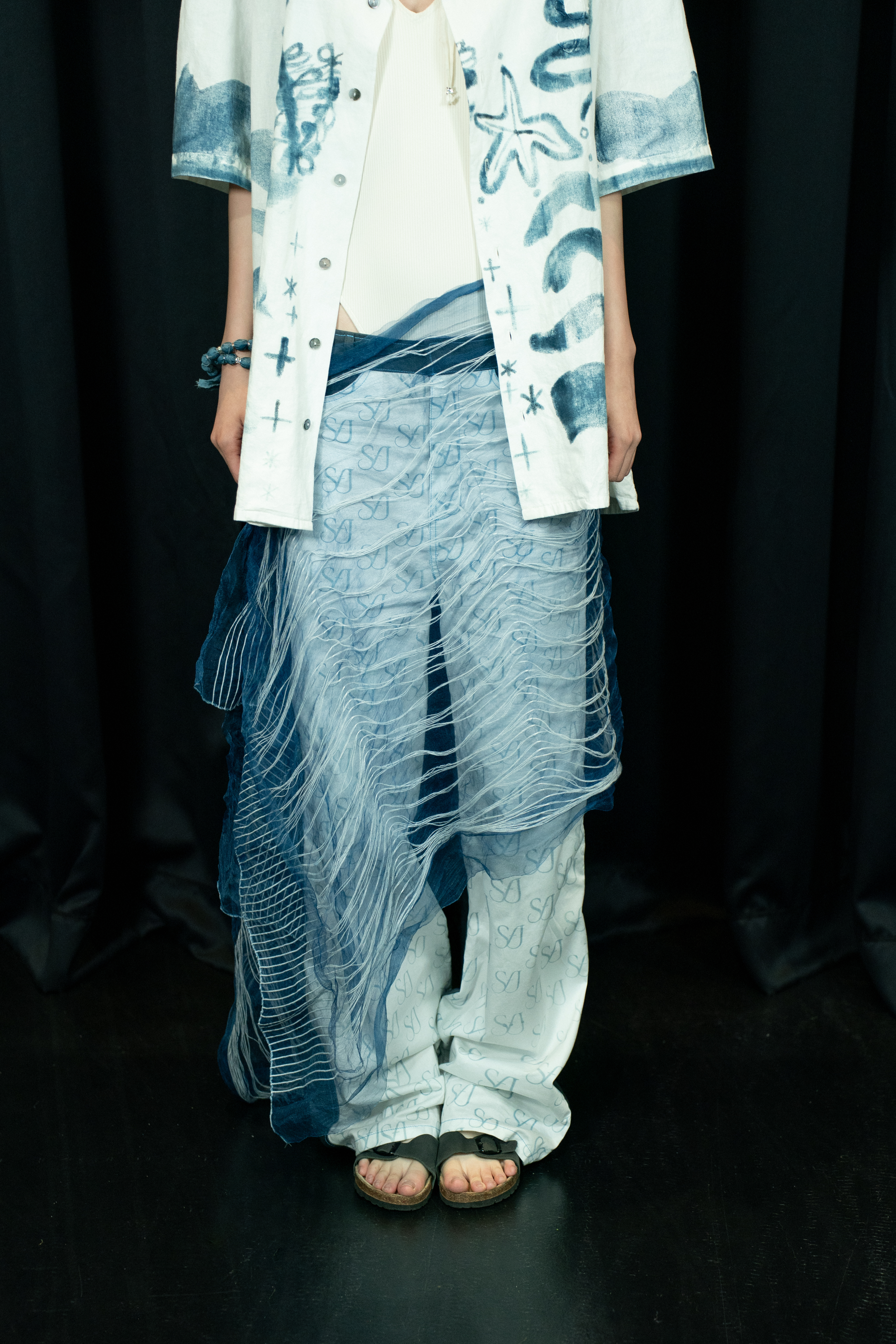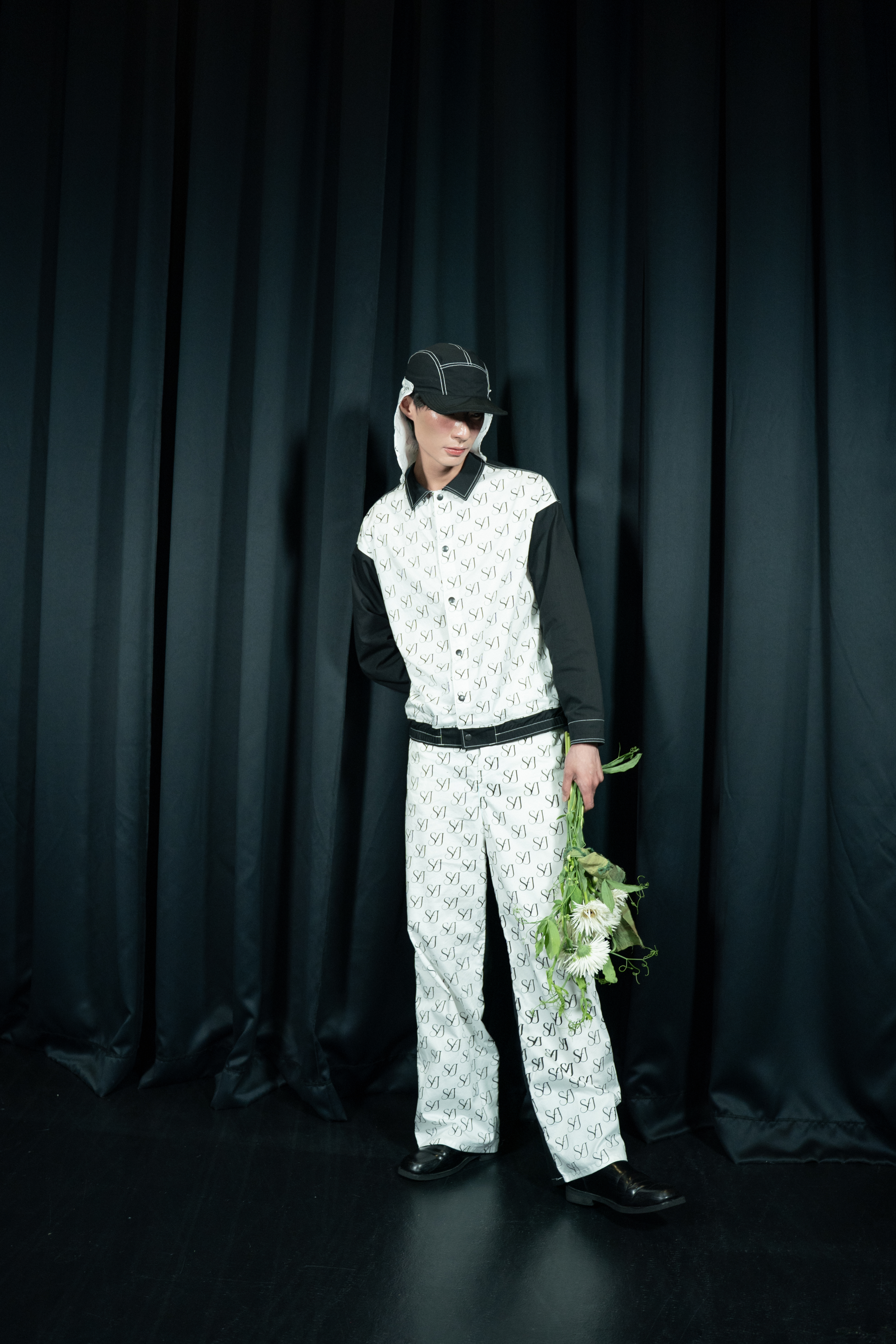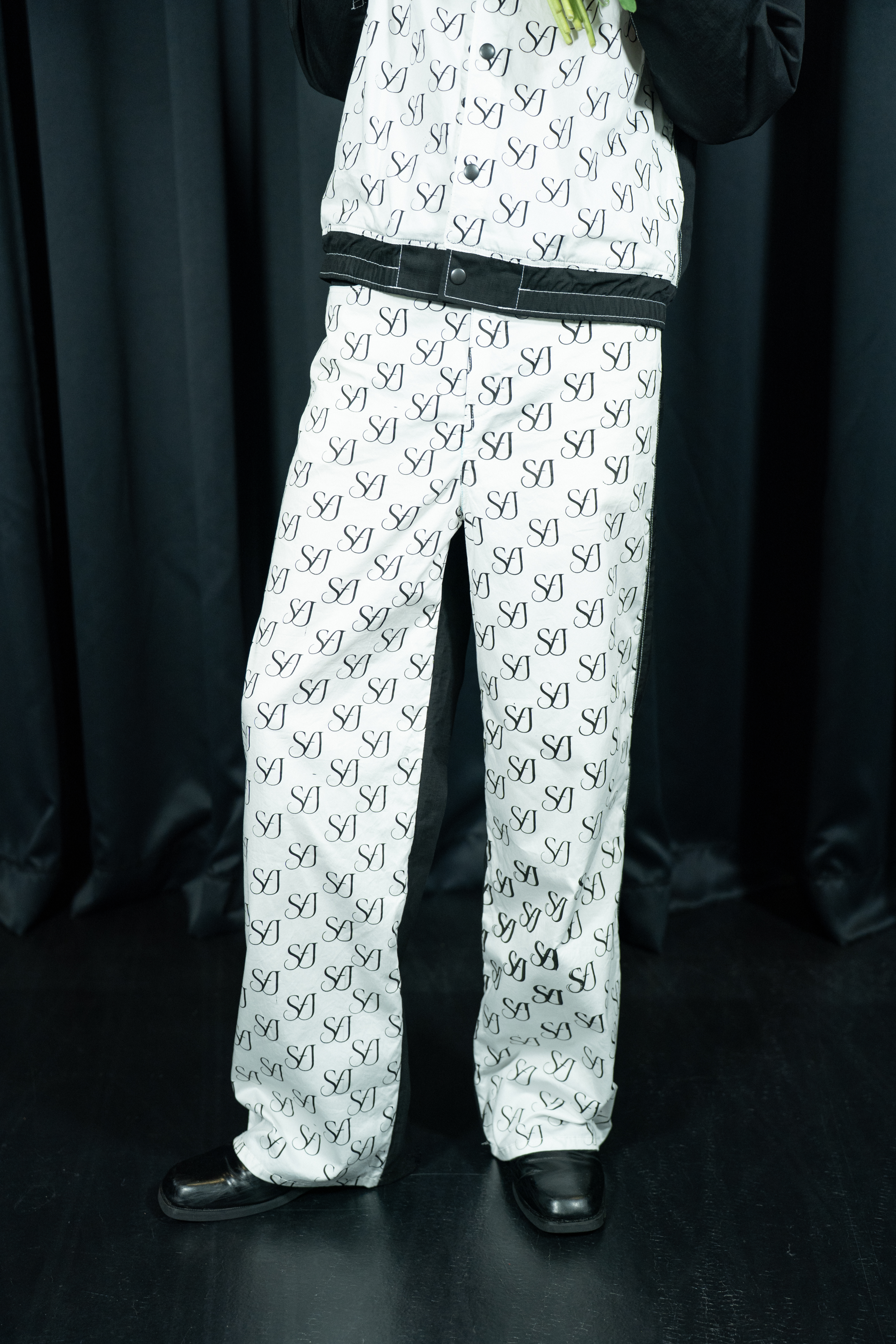 실크스크린 위를 지나간 먹의 흔적이 정교한 패턴으로 탄생했습니다. 반복되는 로고 패턴 플레이인 텍스타일 디자인을 컴퓨터 그래픽이 아닌 사람의 손으로 한 땀 한 땀 찍어내는 과정은, 고도의 집중과 긴 시간 속에서 오직 정성으로 완성됩니다. 크롭한 상의의 블루종과 와일드한 실루엣의 팬츠 조합은 모던하면서도 럭셔리한 매력을 동시에 가집니다.