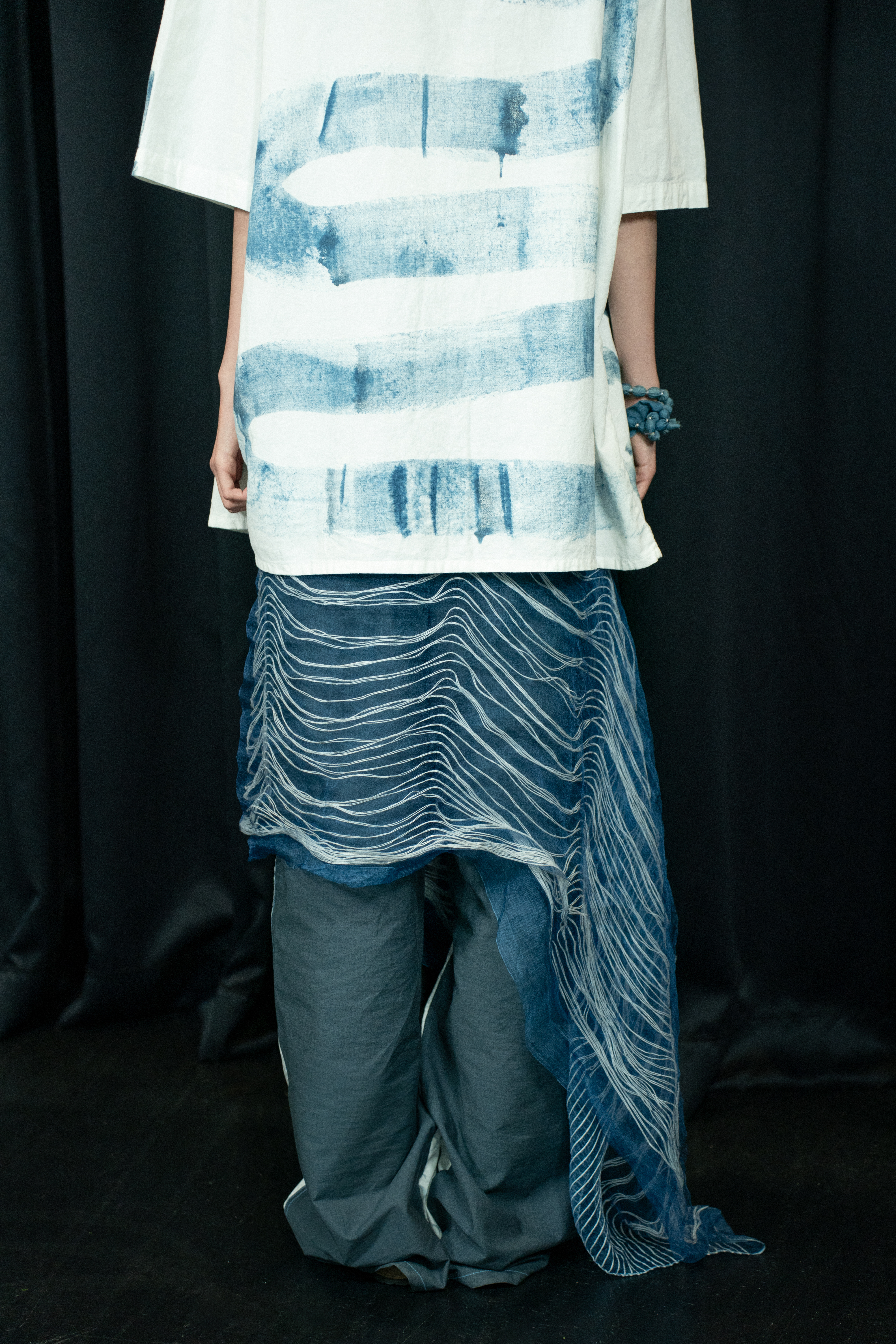 원하는 테마와 아이디어를 구상 후 원단 위 기본 스케치 작업을 합니다. 묽은 쪽물을 물감 형태로 점성있게 만듭니다. 원하는 대로 자유롭게 그림을 그리며 드로잉과 발색이 동시에 되는 자연의 신비를 즉석에서 경험합니다. 발색이 모두 완료되면 수세해 염색되지 않은 부산물을 씻겨냅니다.