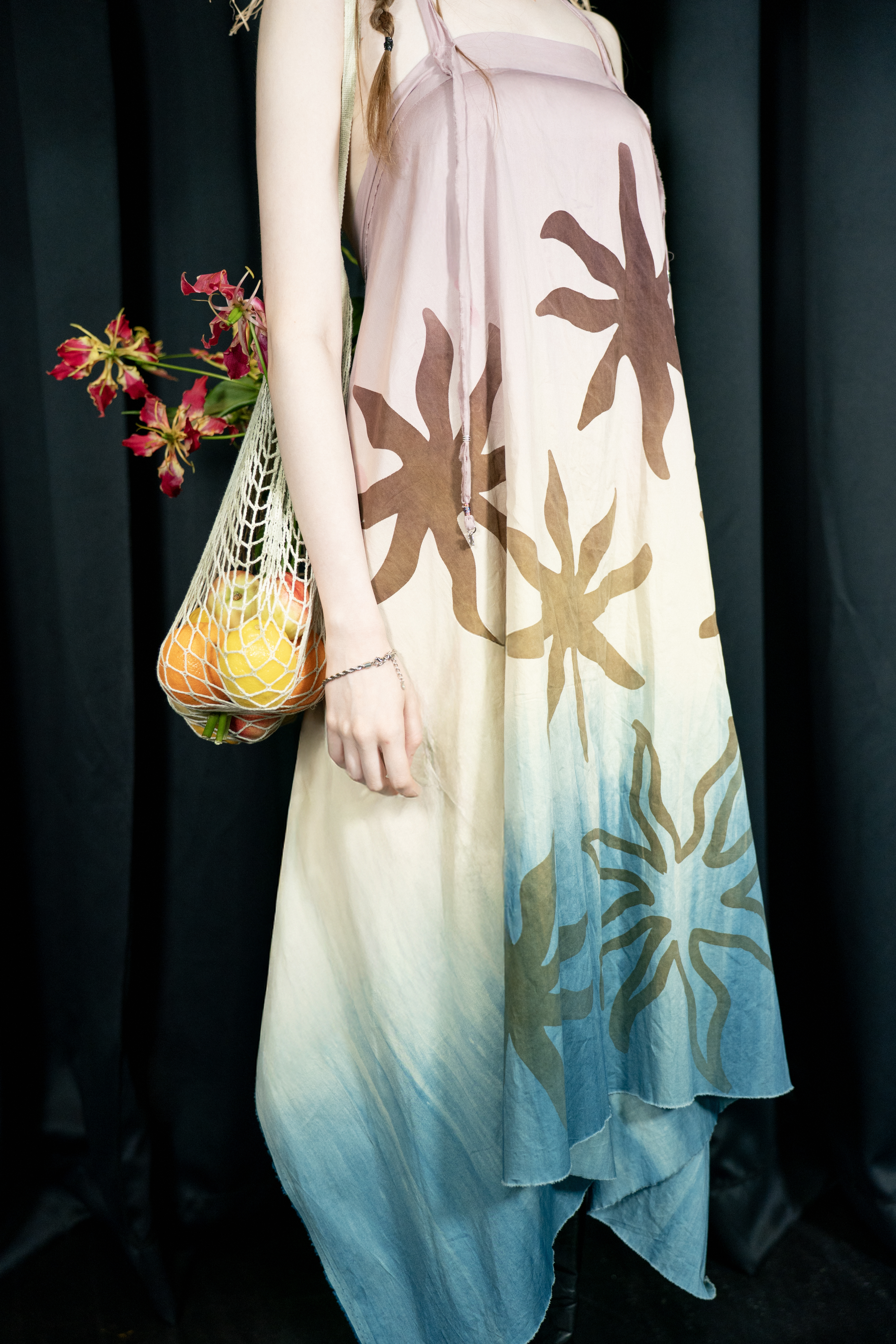 락, 양파껍질, 인디고를 차례로 사용해 그라데이션을 낸 후 태양빛의 실루엣을 실크스크린으로 담아냈습니다.