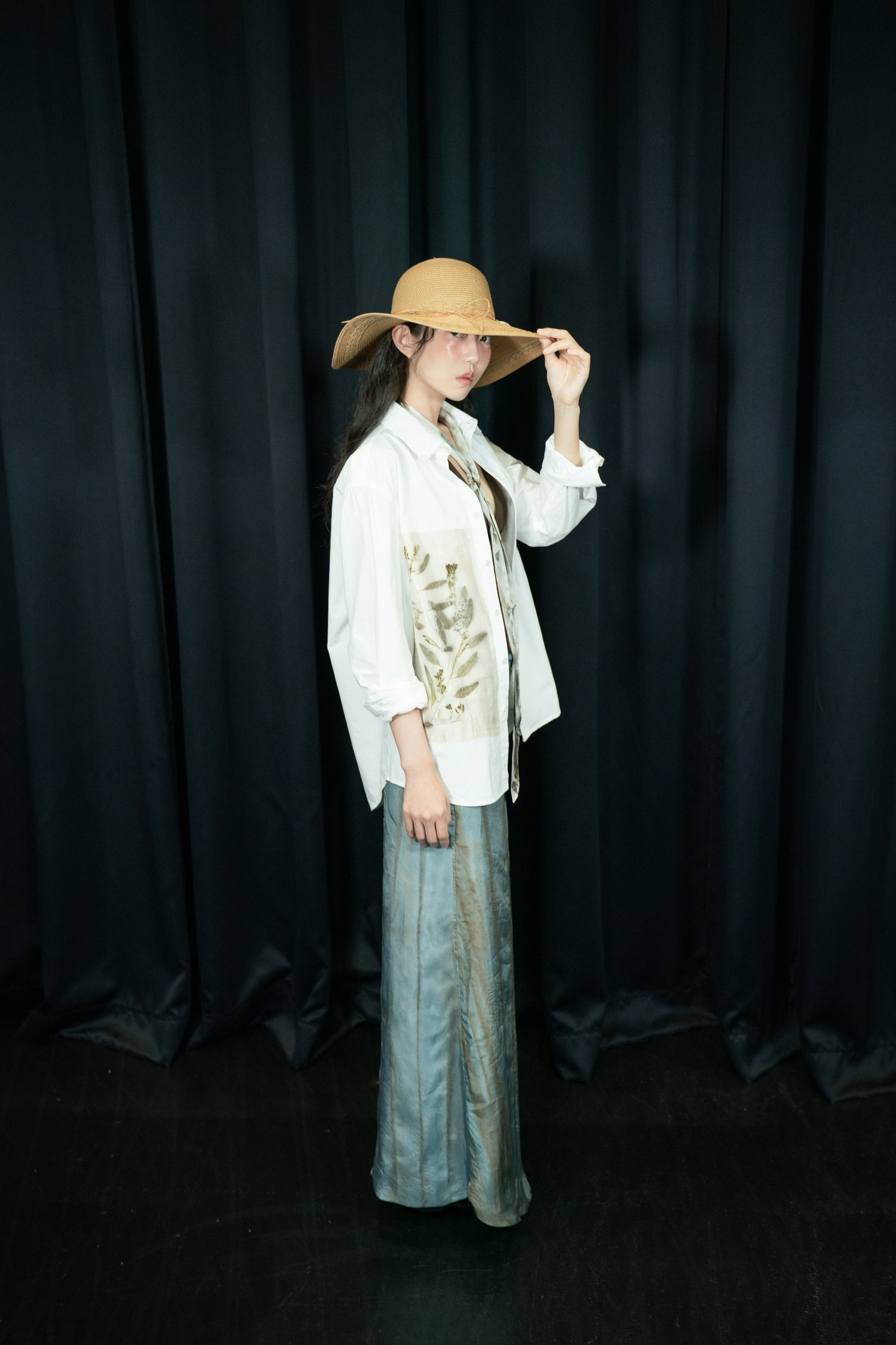 나뭇잎과 꽃으로 작품을 만든 뒤 셔츠에 자유롭게 패치워크 형식으로 마무리했습니다. 정형화된 느낌보다는 러프한 그대로의 질감을 살리기 위해 시접 마무리 대신 커팅으로 표현해 아티스틱함을 강조했습니다.