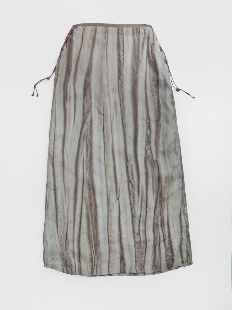 풋감을 짜낸 후 원단에 감즙을 묻힌 뒤 세로로 길게 주름을 잡습니다. 햇볕에 2주 정도 구워 갈색을 냅니다. 그 뒤 다양한 컬러로 배경색을 입힙니다. 쪽으로 하늘과 파랑을, 치자로 노랑을, 이 둘을 합쳐 초록을 물들입니다.