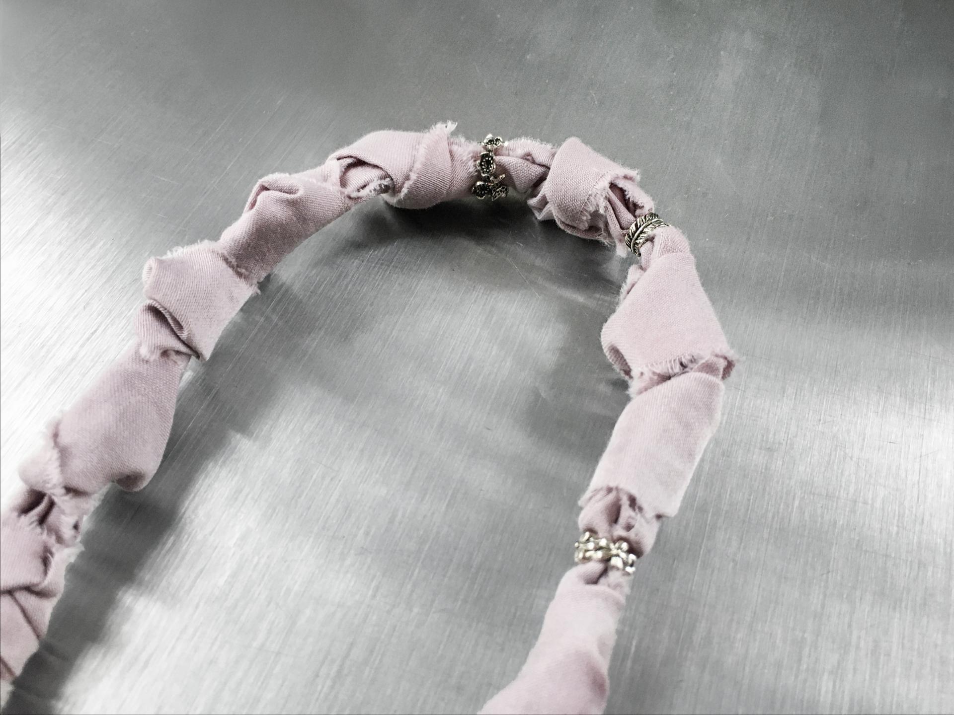 옷을 만들고 남은 자연염색 원단 조각을 조심스럽게 꼬아 완성한 보타이 목걸이입니다.
