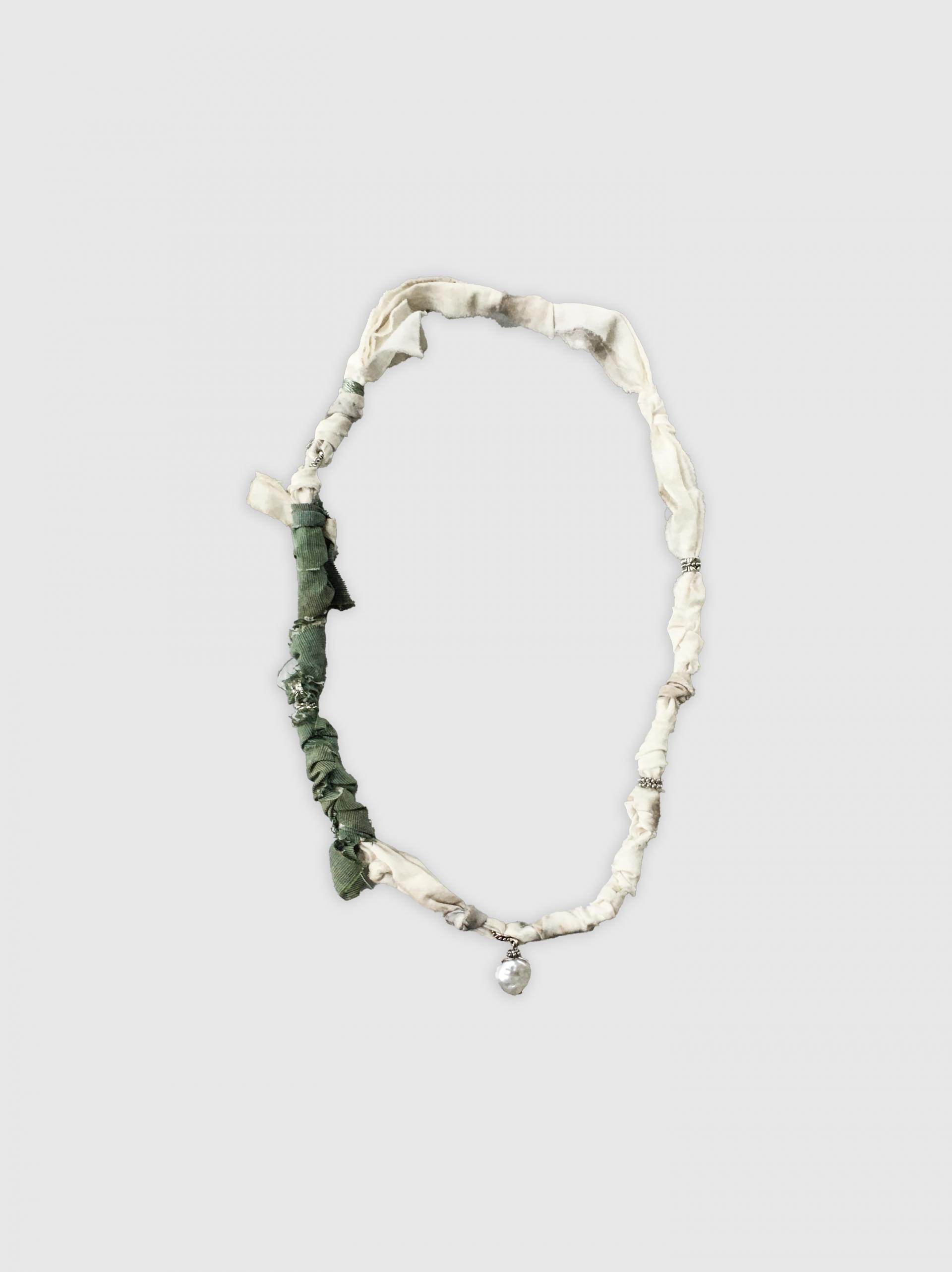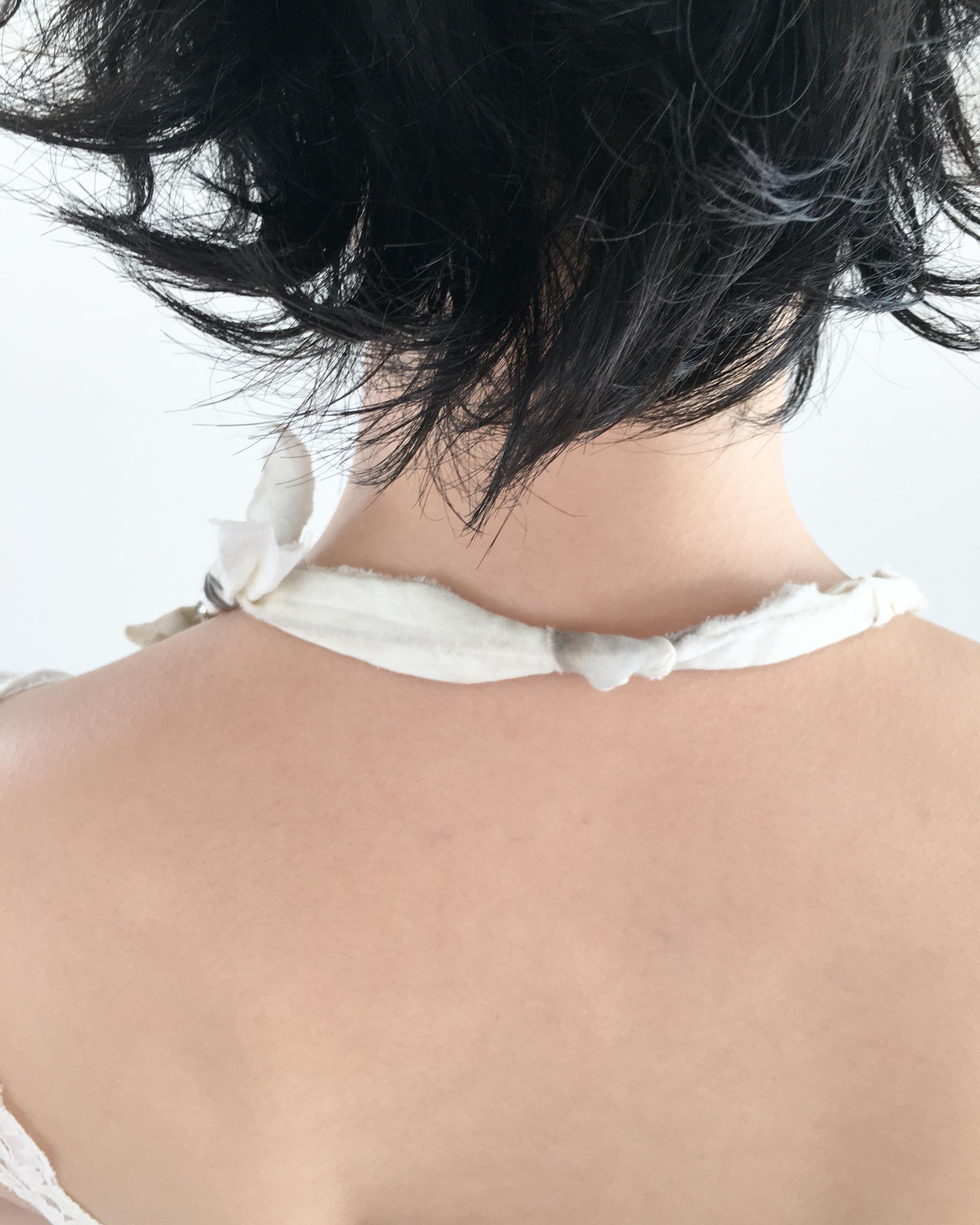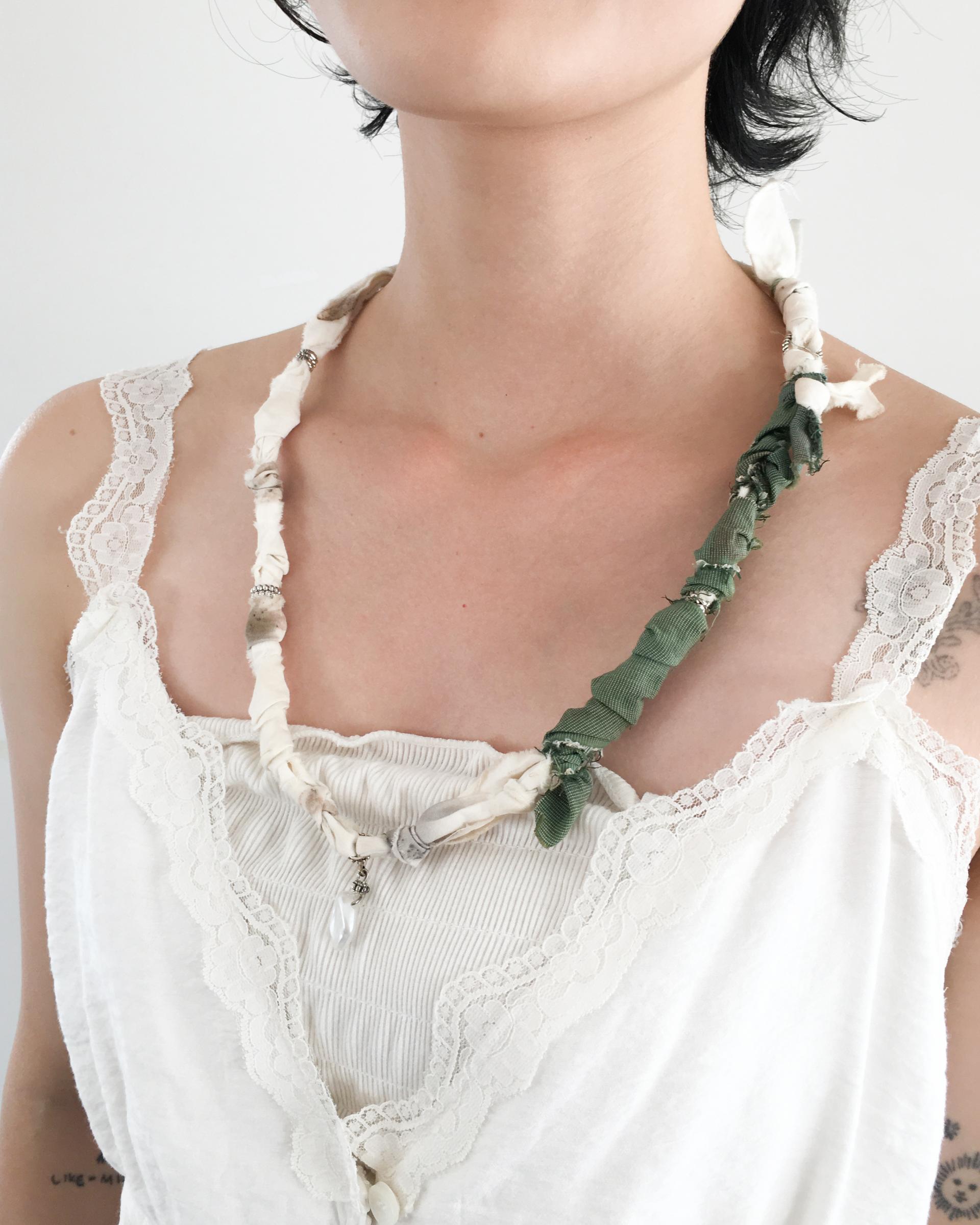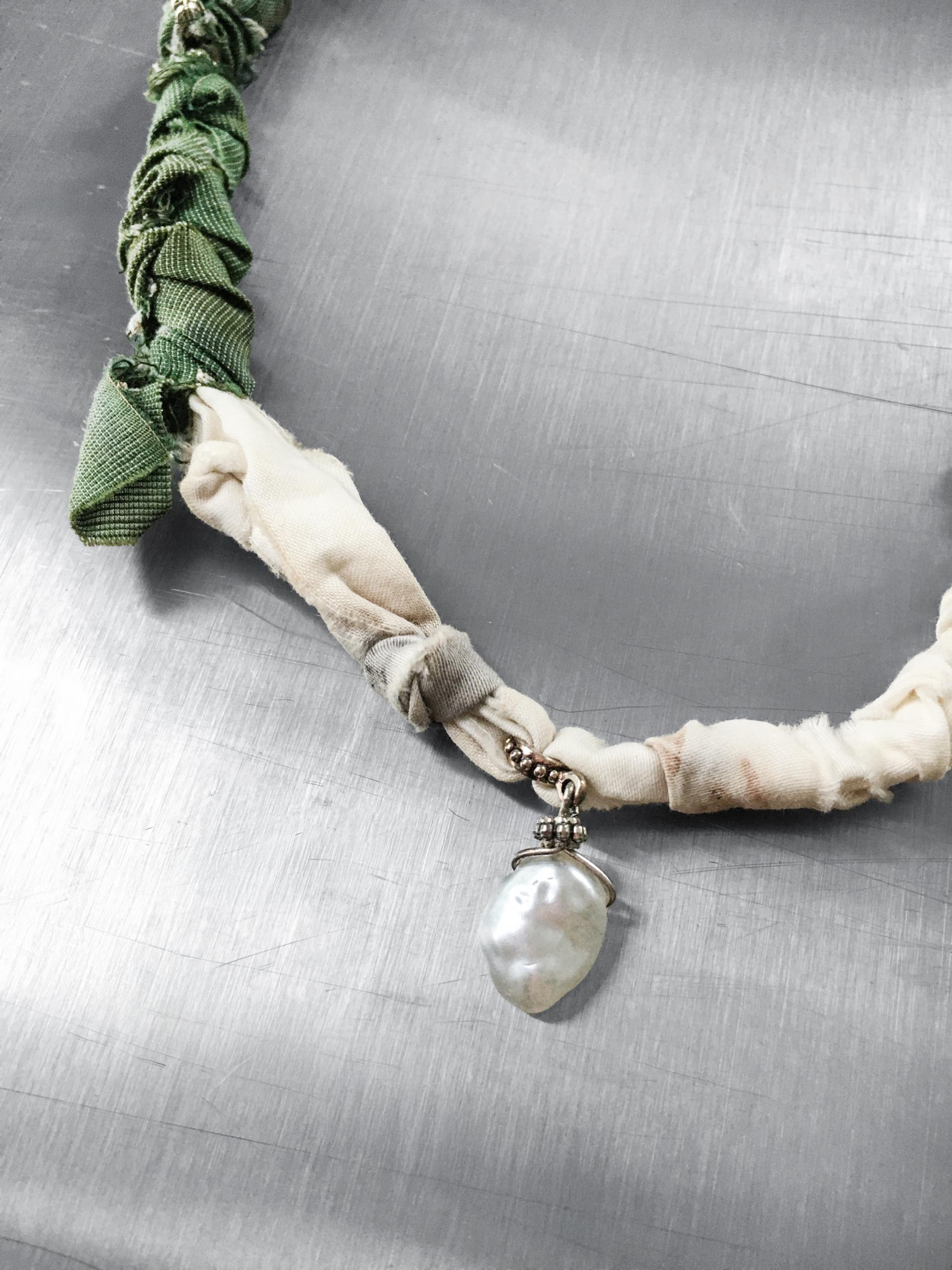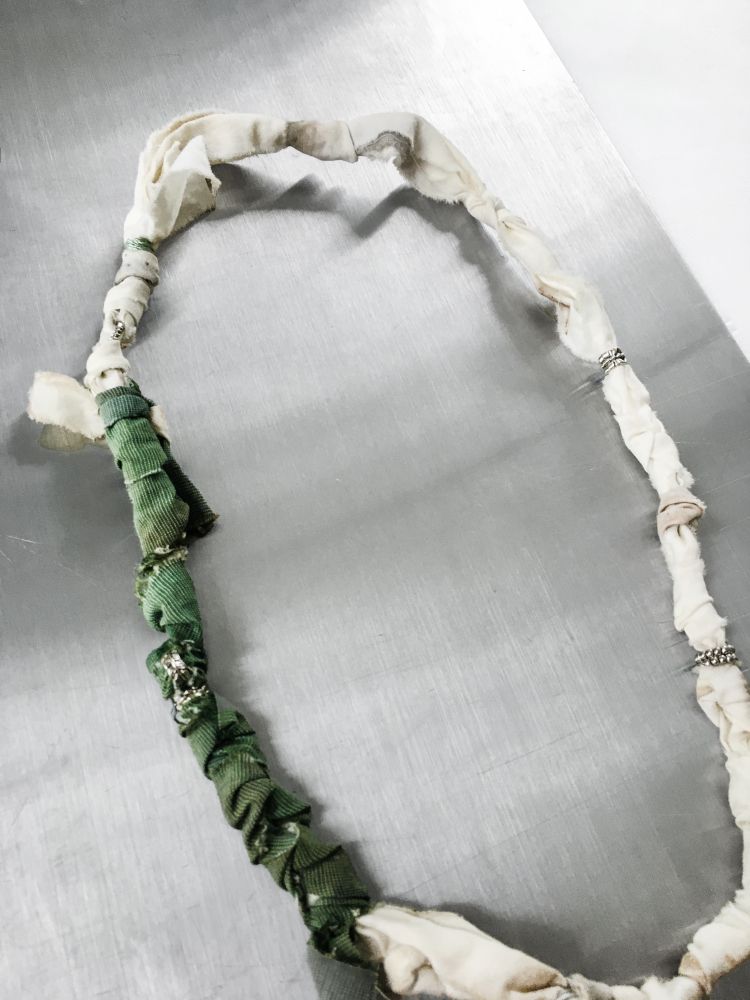 옷을 만들고 남은 자연염색 원단 조각을 조심스럽게 꼬아 완성한 보타이 목걸이입니다.