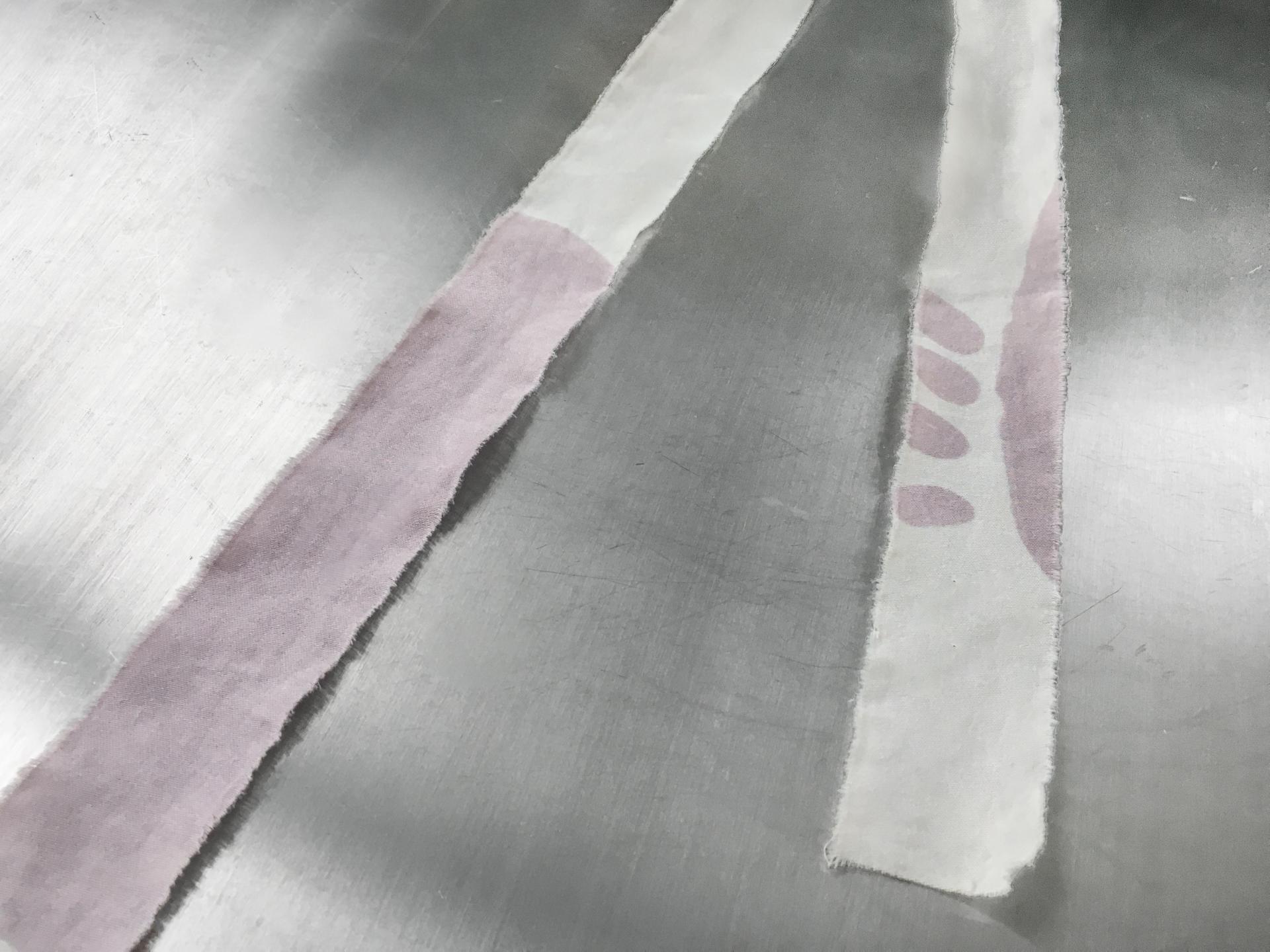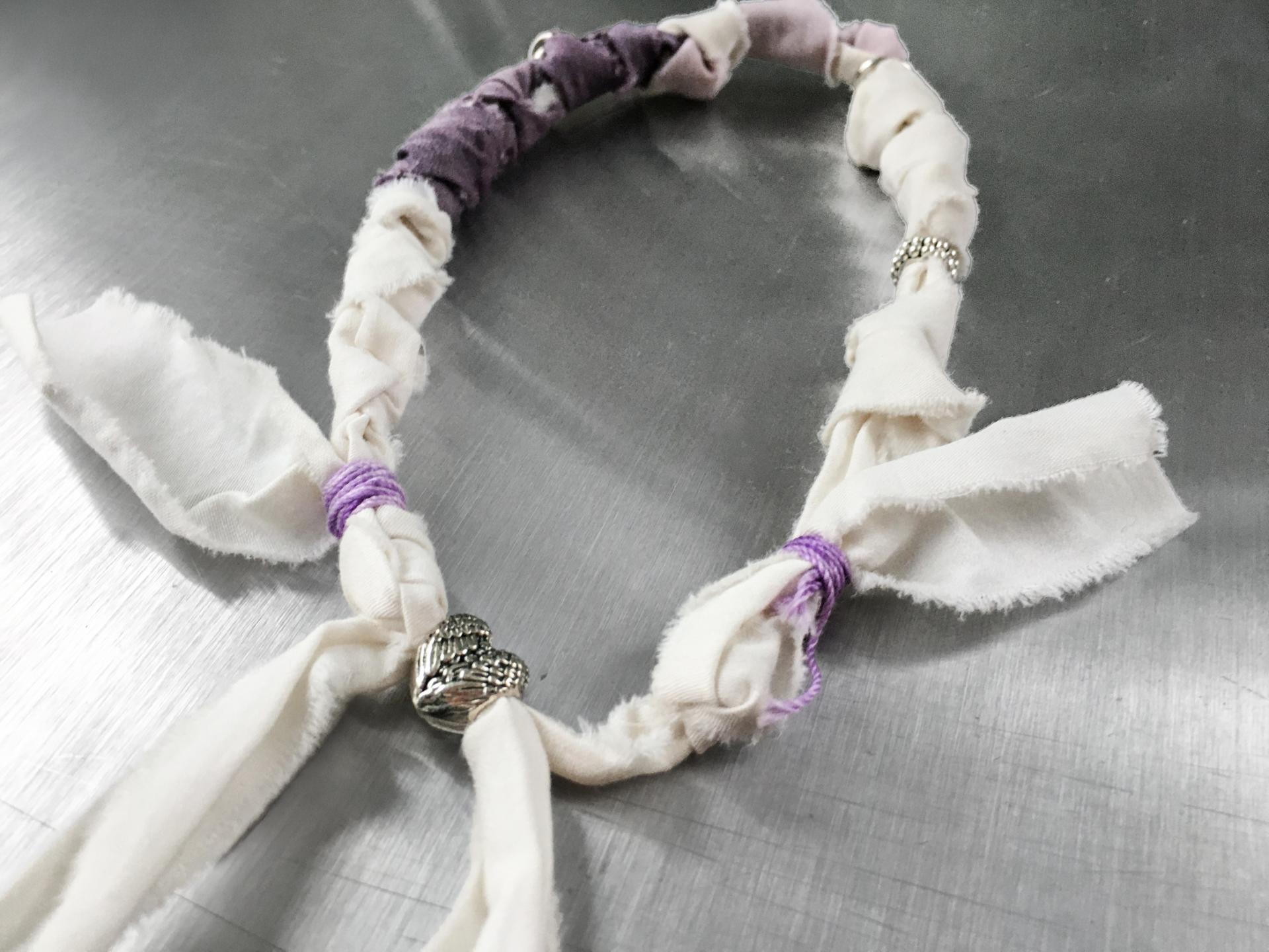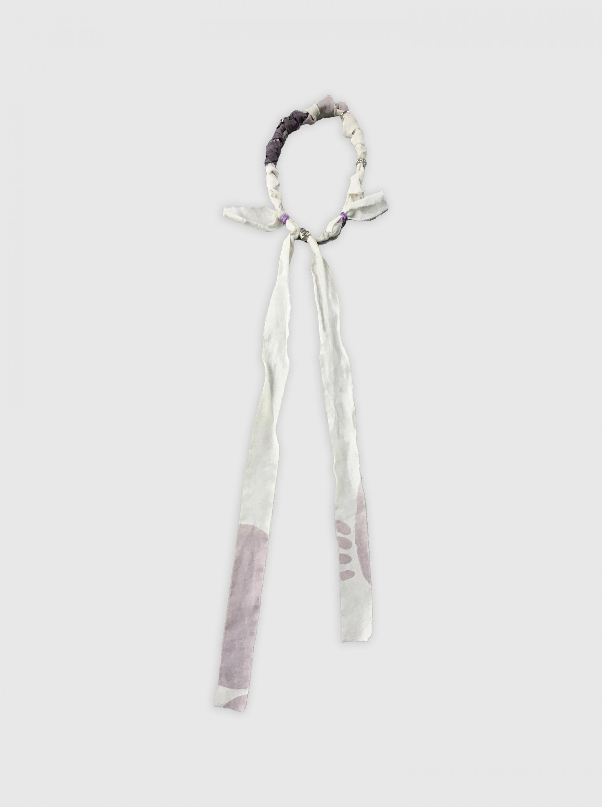 옷을 만들고 남은 자연염색 원단 조각을 조심스럽게 꼬아 완성한 보타이 목걸이입니다.